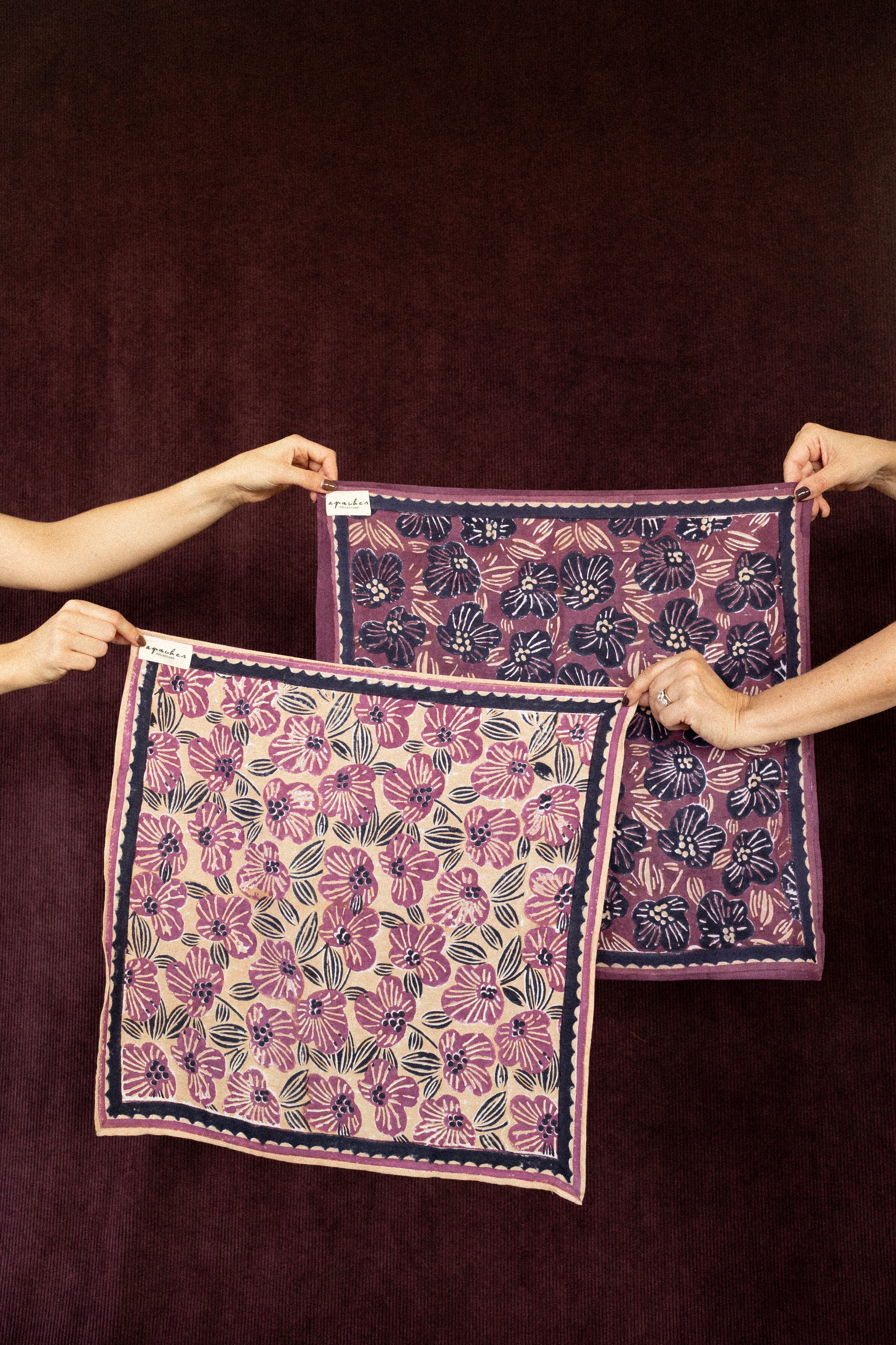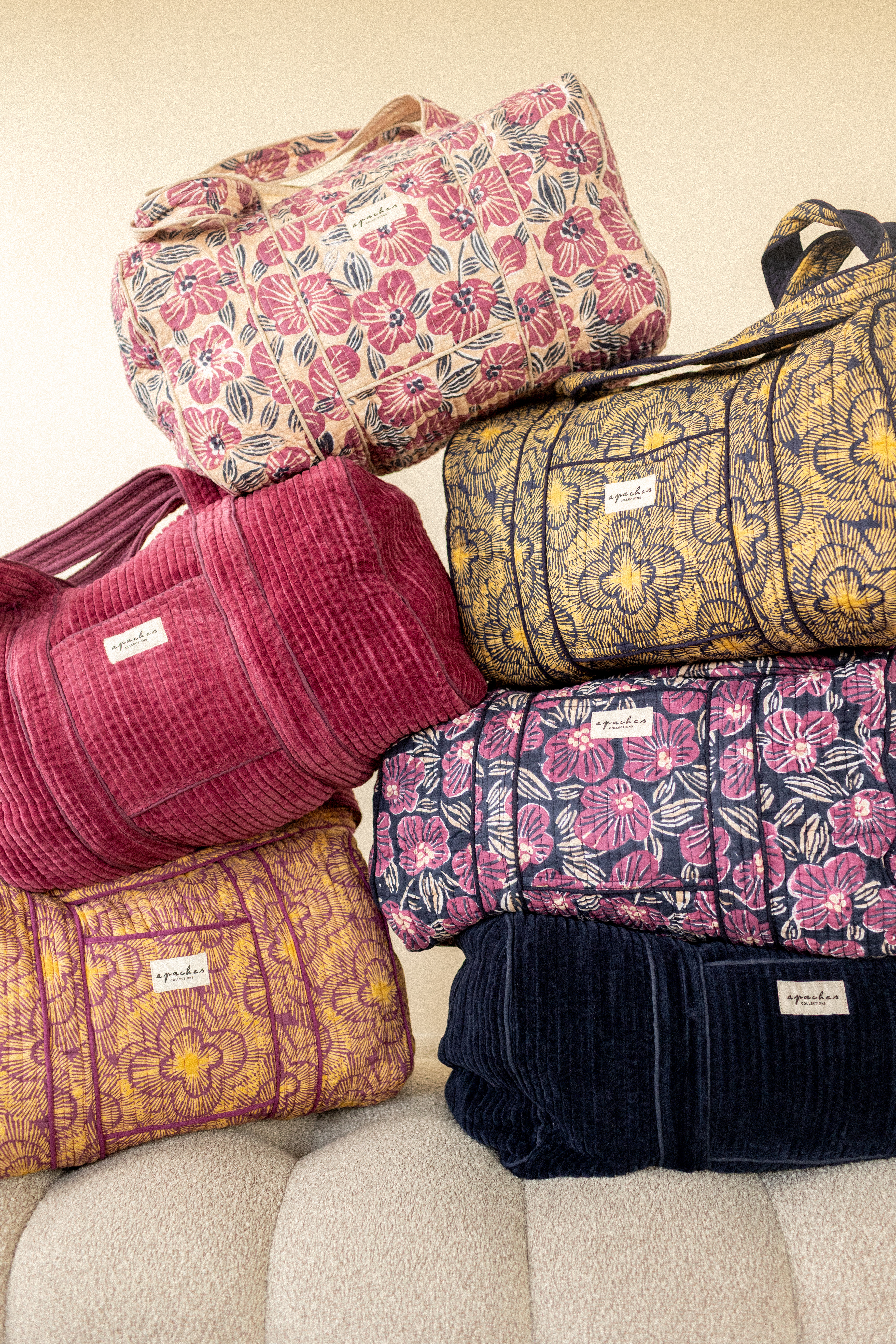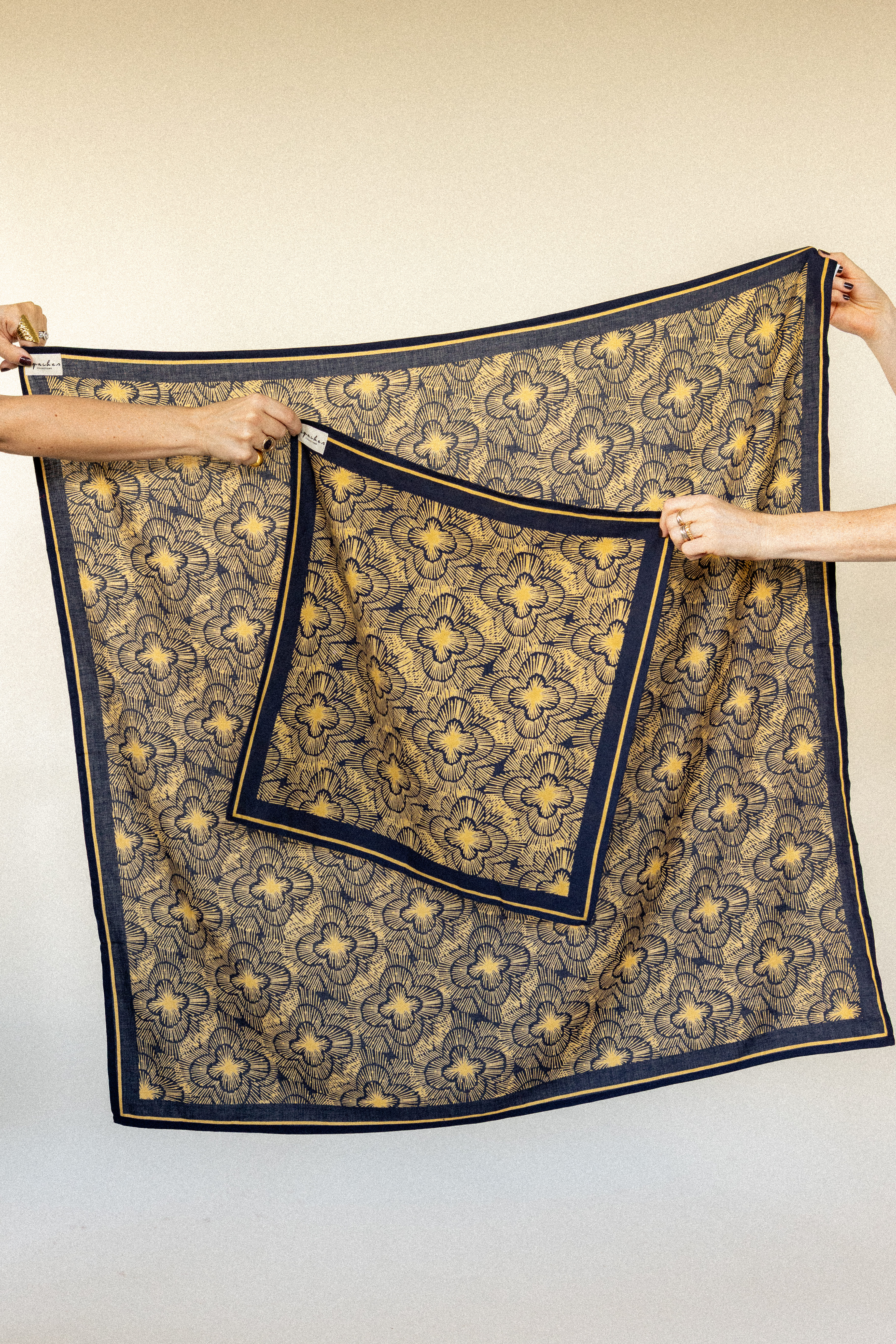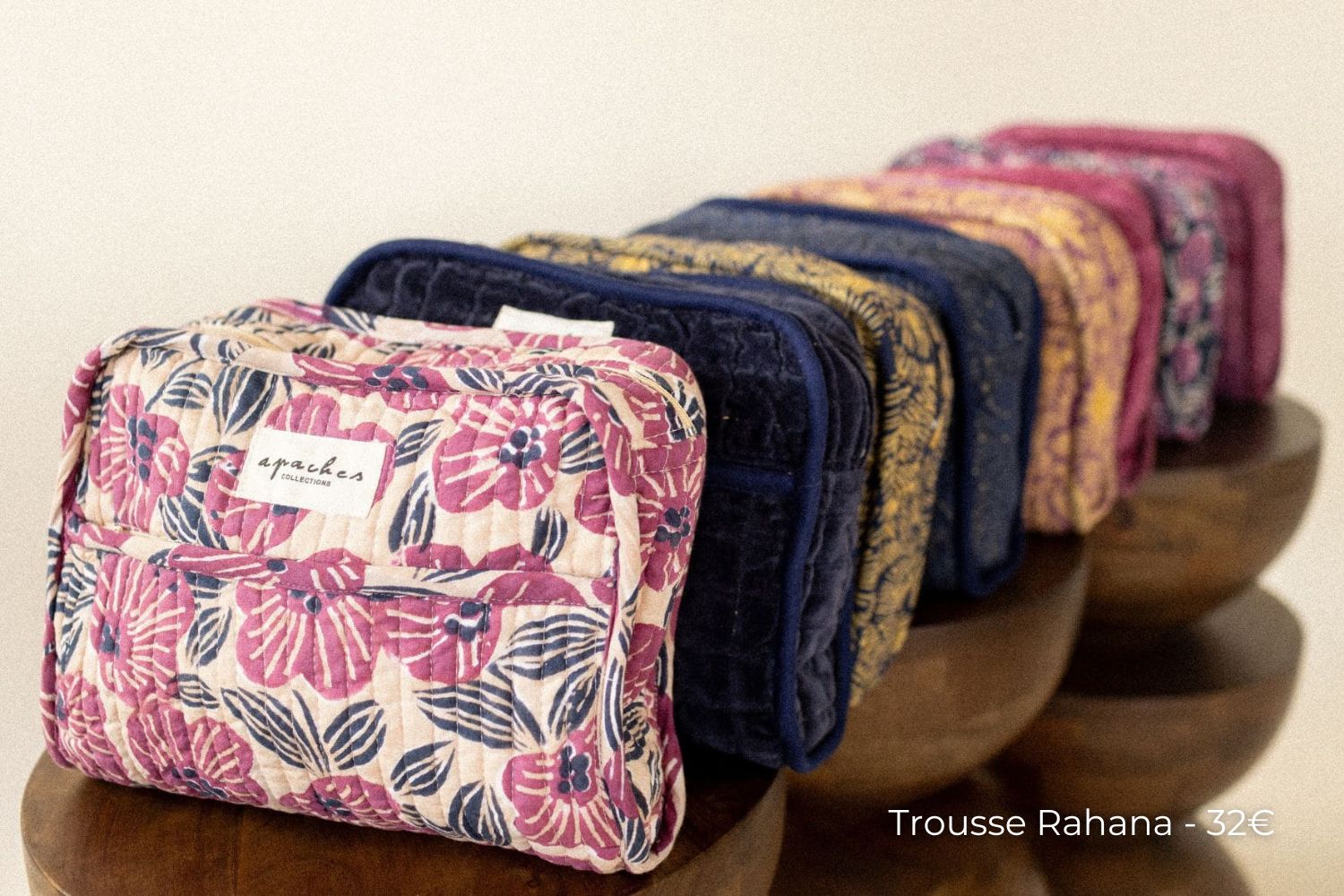 Une histoire de textures et de contrastes. Le velours lisse apporte sa touche de douceur sur les accessoires, et les foulards en coton dévoilent leurs motifs de caractère et leurs couleurs vibrantes.
