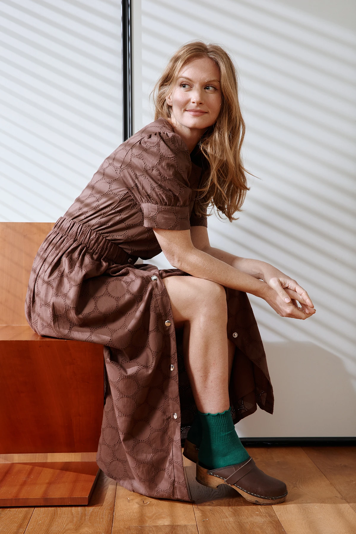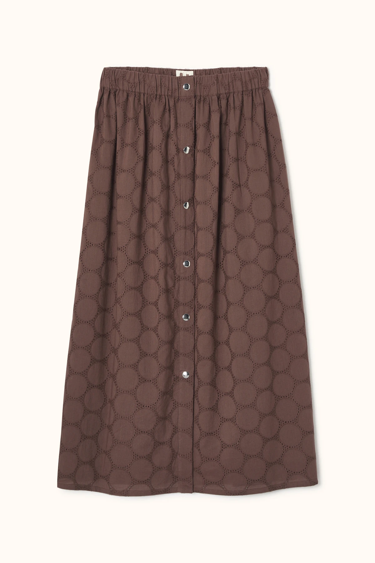 La jupe longue NEELO en coton brodé séduit par ses textures délicates et son élégance naturelle. Entièrement doublée pour un confort optimal et une opacité parfaite, elle est agrémentée d’une ceinture froncée qui apporte de l’ampleur dès le haut de la silhouette. Son ouverture à patte de boutonnage avec boutons-pression ajoute une touche moderne et pratique.