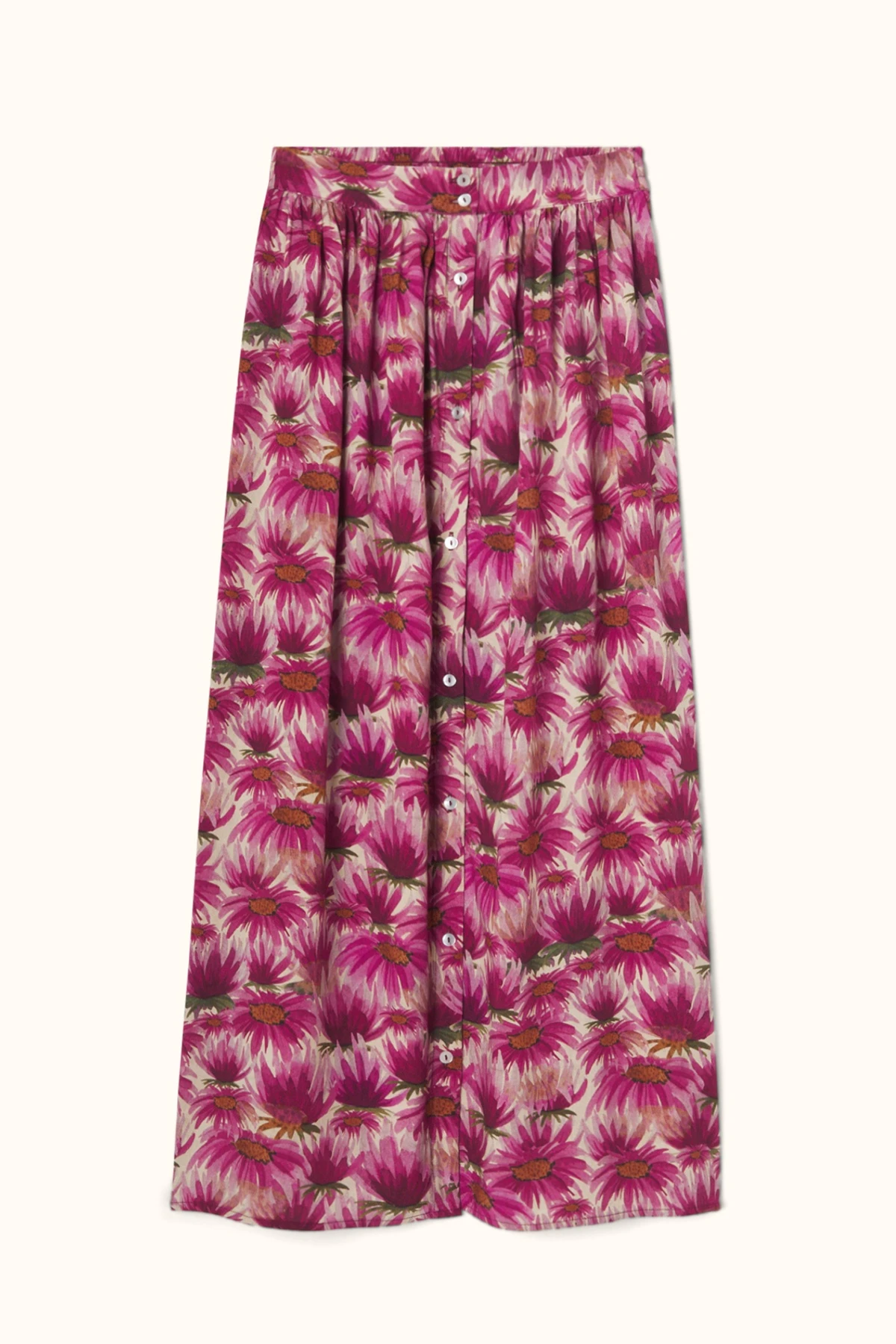 Fluide et raffinée, la jupe longue NEELA en viscose offre un tombé élégant et aérien. Les boutons-pression dorés sur l’ouverture avant ajoutent une touche lumineuse et moderne. La ceinture froncée structure la taille et crée un volume harmonieux pour un look sophistiqué et féminin.