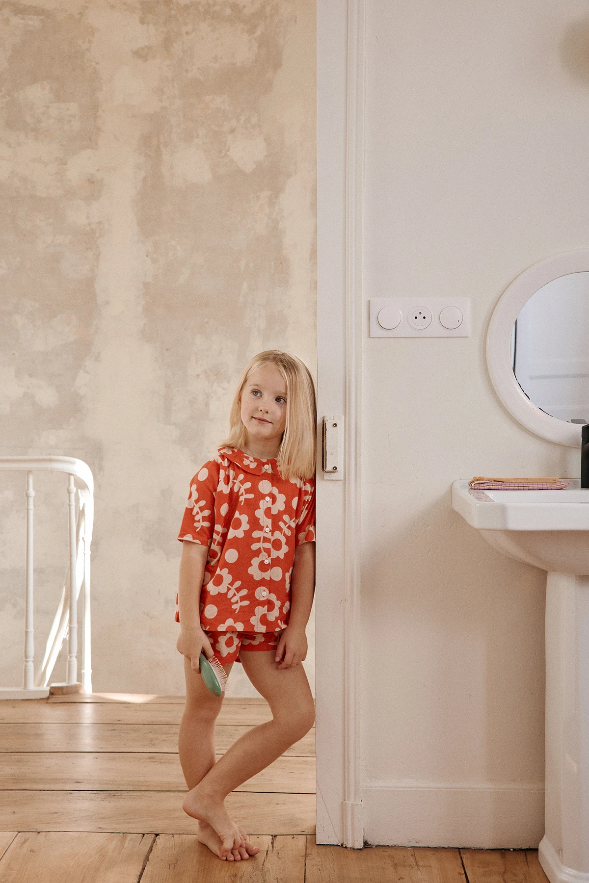 Le pyjama PASERA en coton séduit par son confort et son style. Son haut à col froncé avec biais à l’encolure et patte de boutonnage se combine à des manches courtes à revers, tandis que le short taille élastiquée assure une tenue agréable, longueur mi-cuisses.