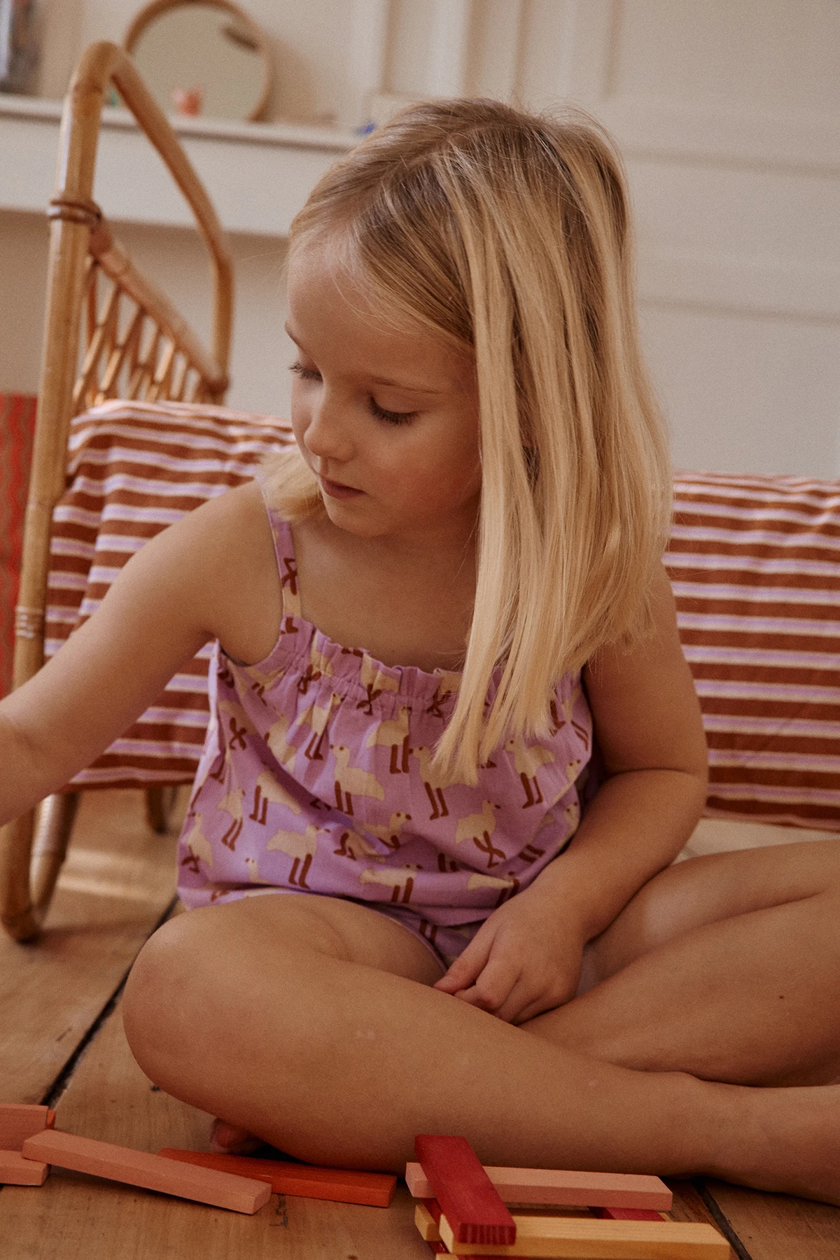 Le pyjama PASERU en coton séduit par son style léger et confortable. Son haut à fines bretelles et encolure élastiquée froncée se complète d’un short taille élastiquée, longueur mi-cuisses, pour des nuits douces et agréables.