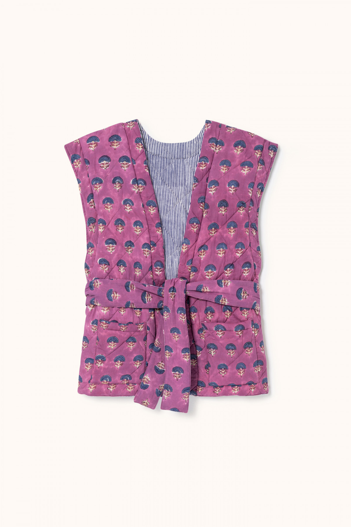 Nouvelle veste de cette saison, notre veste sans manche Jay fait son retour dans cette collection. Réversible, vous allez adorer la porter une fois côté rayures, une fois côté imprimé Fuchsia. Facile à porter, sa ceinture amovible vous permettra de garder une taille marquée ou non.