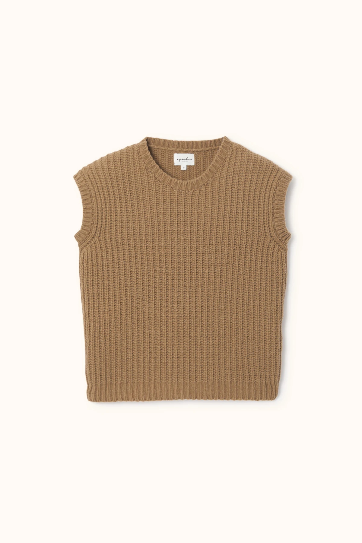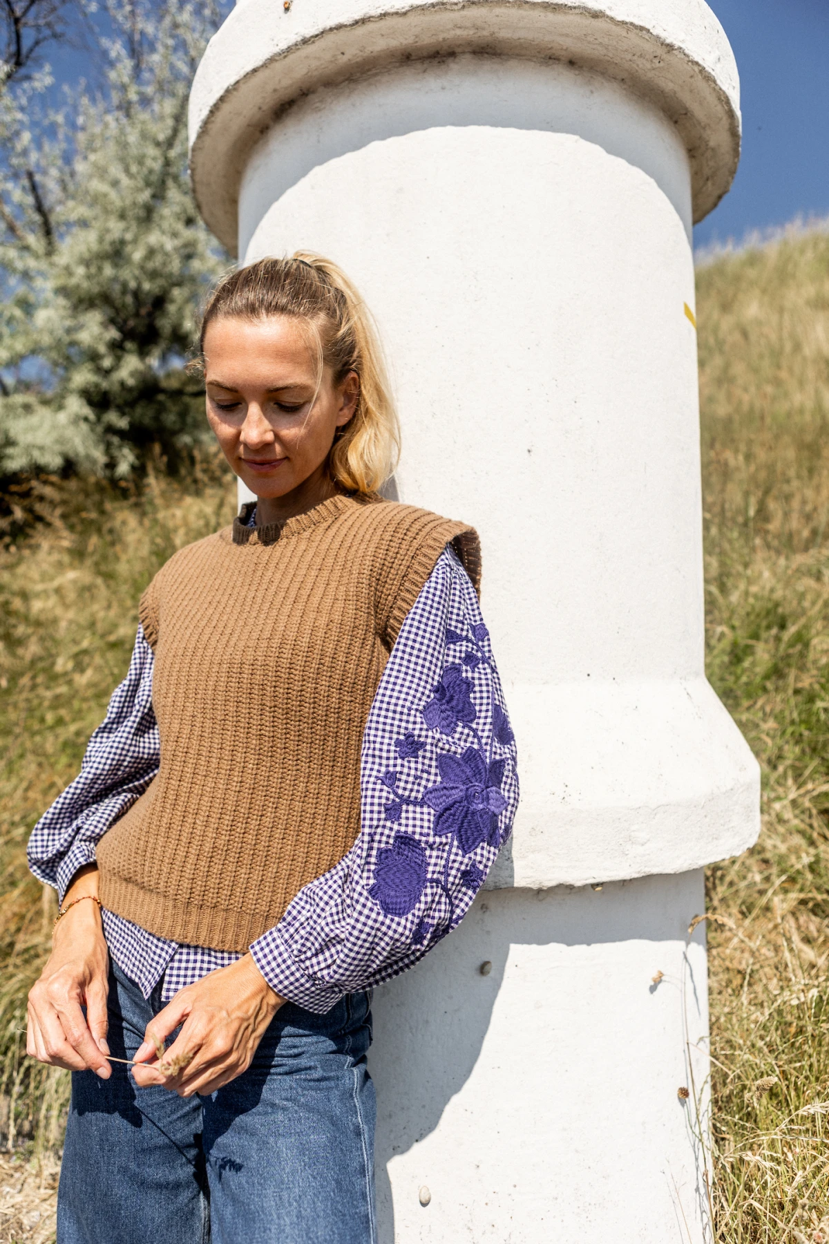 Découvrez notre nouveau pull Pulao Macadamia, ce parfait tricot sans manche avec un volume légèrement oversize qui en fera une pièce parfaite à superposer sur toutes vos tenues !