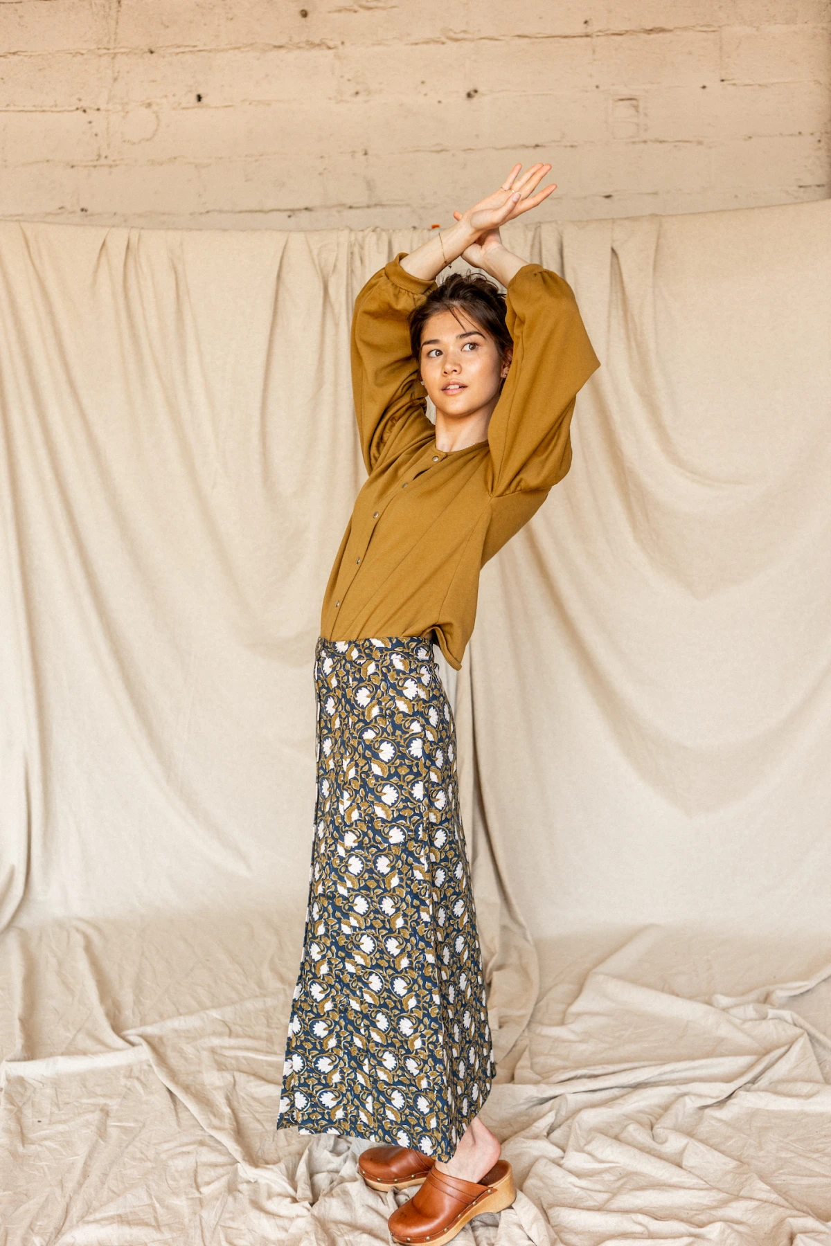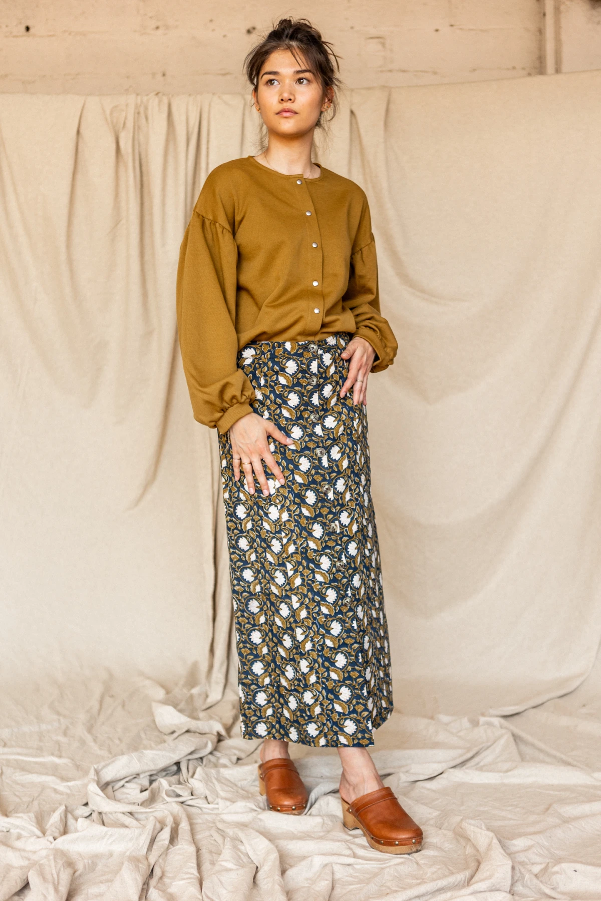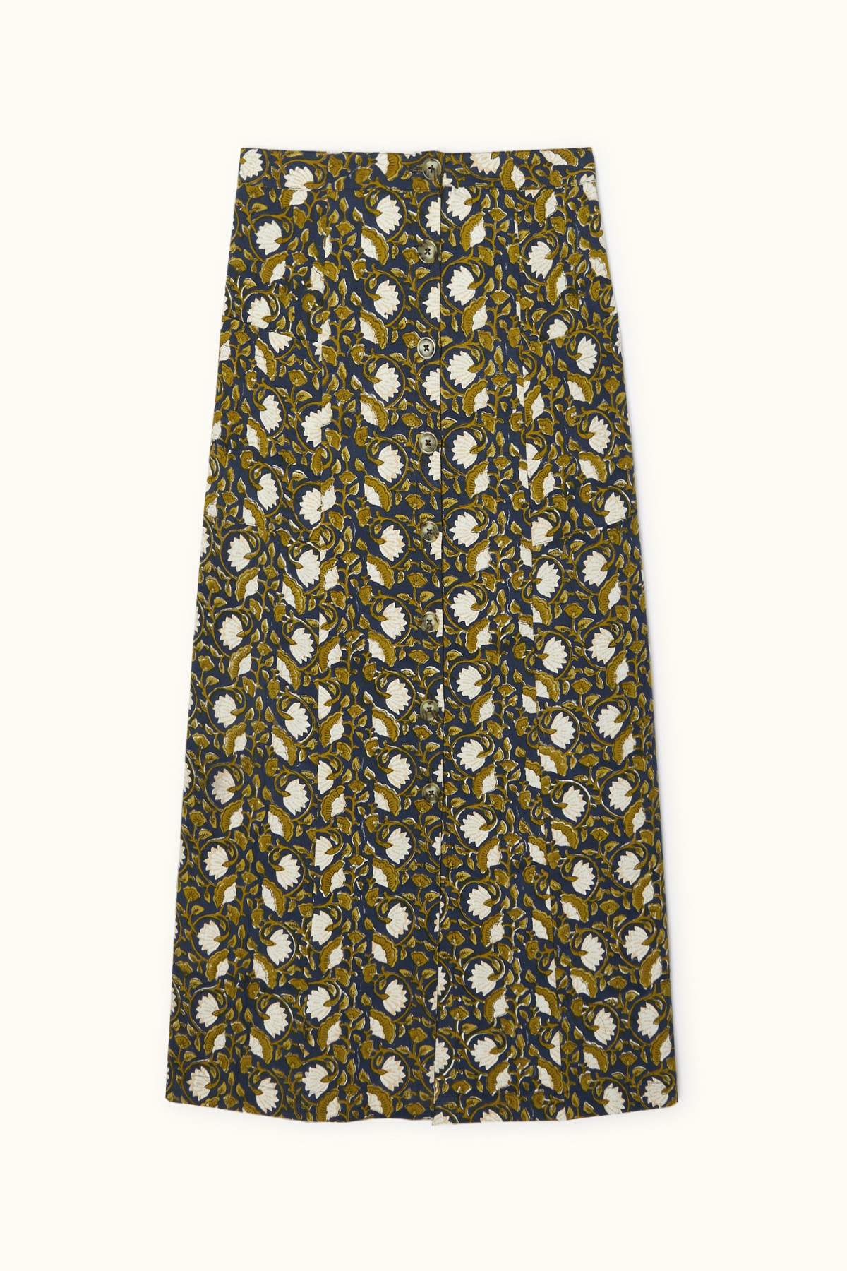 Notre nouvelle jupe Gotama imprimée fleuri "Eventail" Orage sera le choix idéal pour un look hivernal chic ! Longue et boutonnée à l'avant, elle est à la fois stylée et élégante.