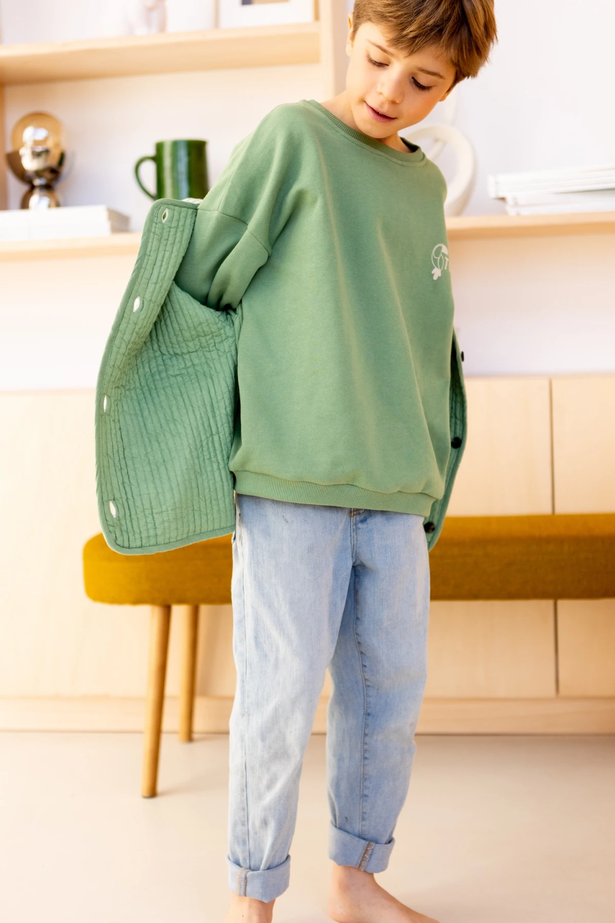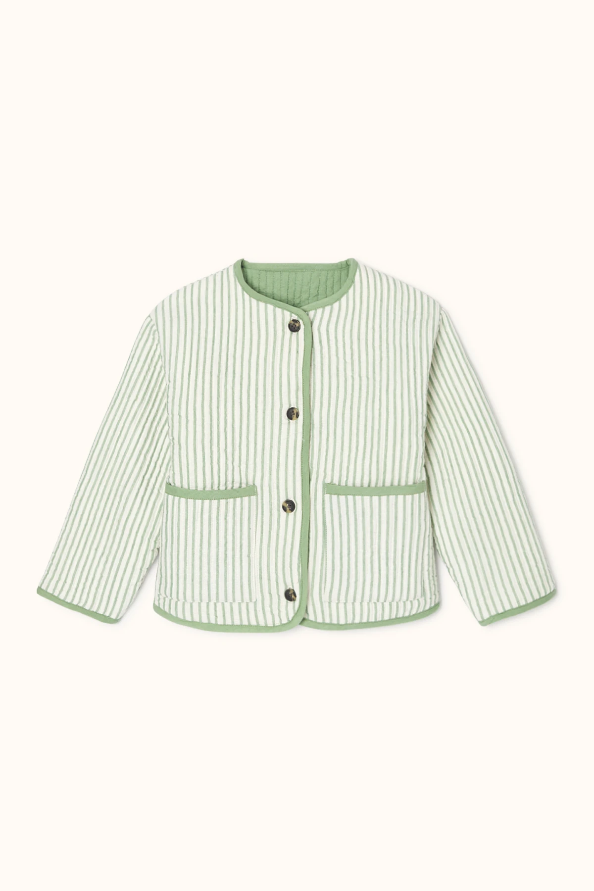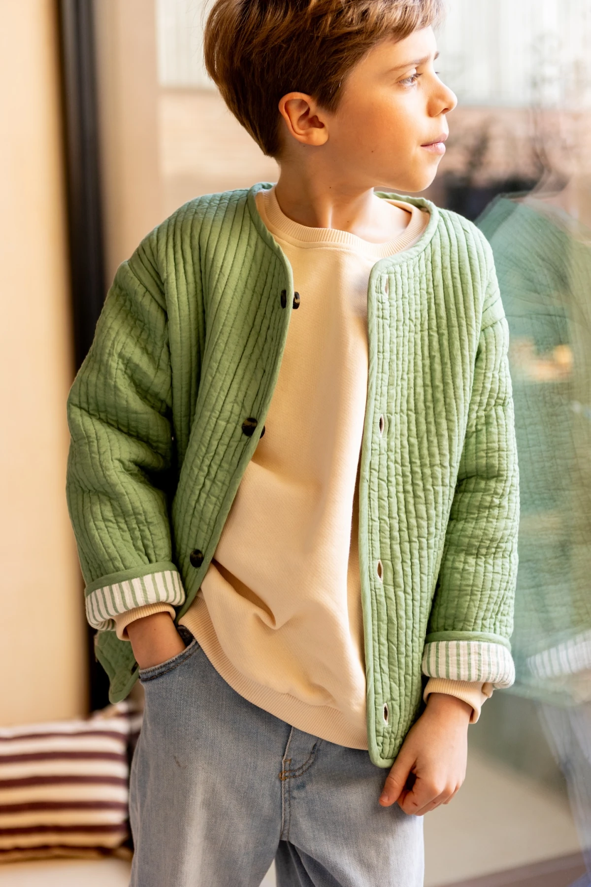 Découvrez Dhoti, notre veste matelassée parfaite pour vos minis. Réversible, elle offre deux styles en un : un côté uni pour la simplicité, un côté rayé pour plus de peps. Pratique et stylée, elle accompagnera vos enfants en toute occasion !