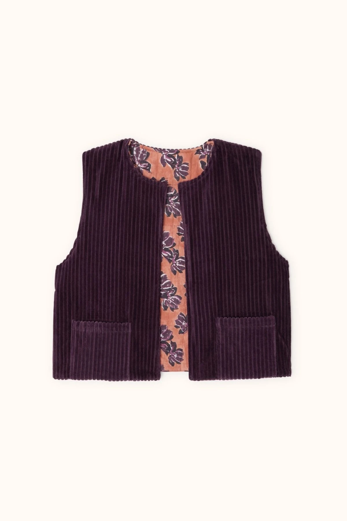 Apaches Collections réinvente sa veste sans manches dans une version fleurie aux teintes douces et automnales. Réversible, elle offre deux styles en un : un velours côtelé uni mauve d’un côté, un imprimé fleuri de l’autre. Matelassée et confortable, elle se pare de deux poches côté velours pour un look tendance et pratique à la mi-saison.