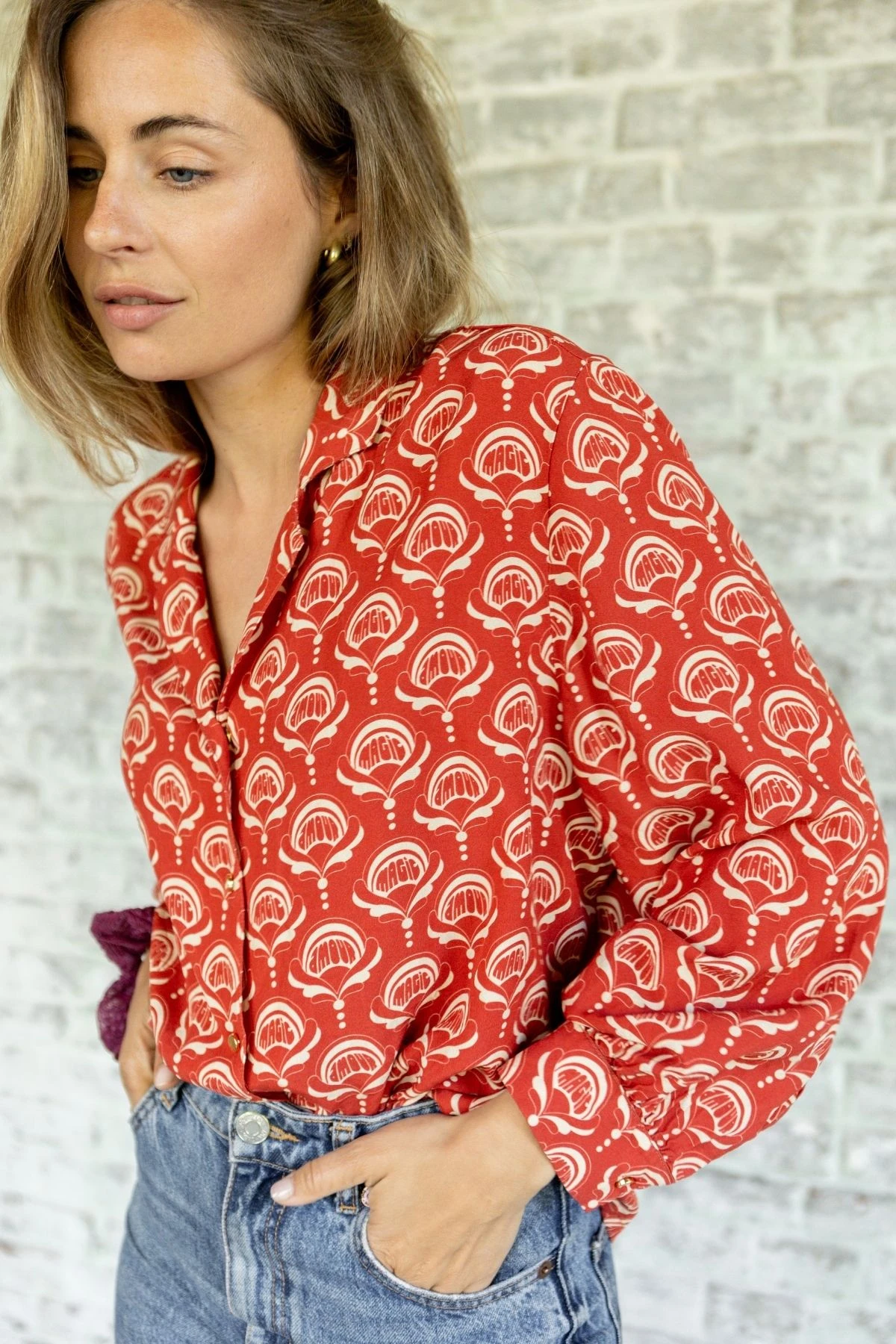 Cette blouse fluide présente une coupe volontairement oversize, idéale pour une silhouette décontractée et moderne.