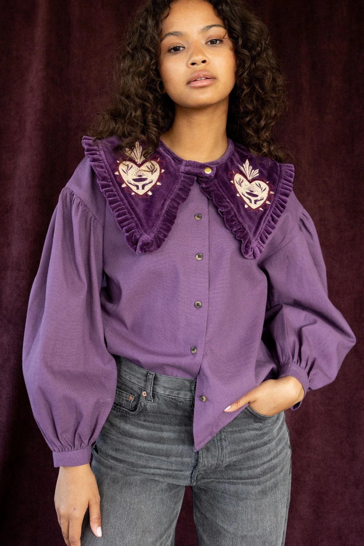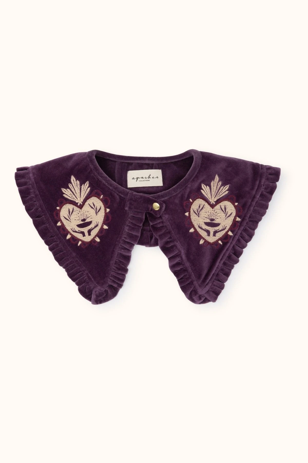 Ajoutez une note élégante à vos tenues avec le col amovible Kalindra en velours lisse. Son petit volant délicat orné de broderies apporte une touche chic à une chemise unie ou imprimée. Facile à fixer grâce à son bouton-pression, il transforme instantanément votre look avec raffinement et originalité.