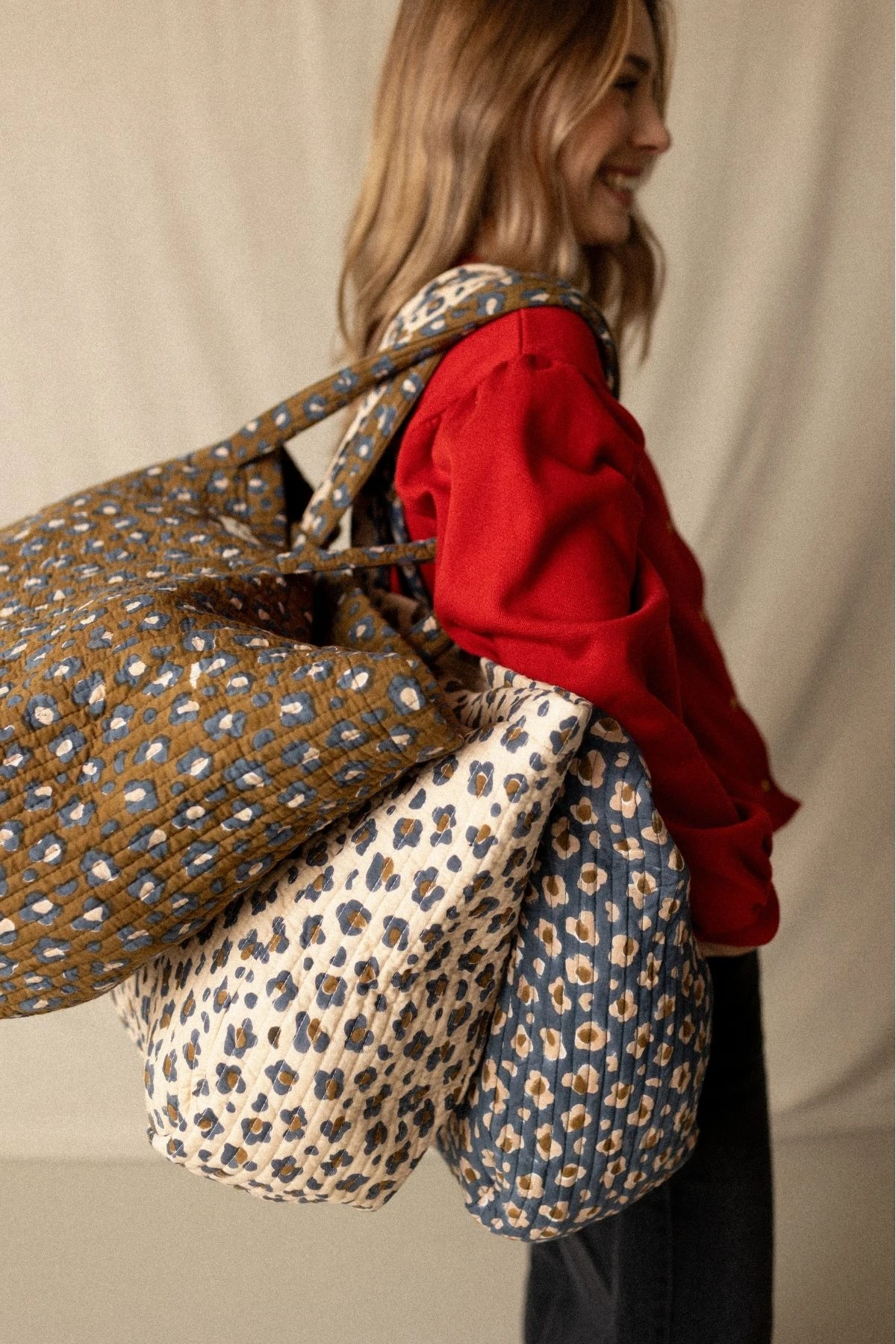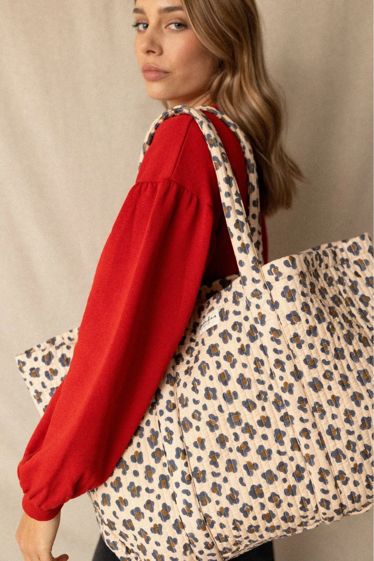 Le cabas SAHA se pare d’un imprimé léopard audacieux qui apporte caractère et style. Son grand format en coton matelassé permet de transporter tous vos essentiels avec aisance, que ce soit pour le marché, la plage ou les sorties en famille. Pratique et tendance, il devient un indispensable au quotidien.