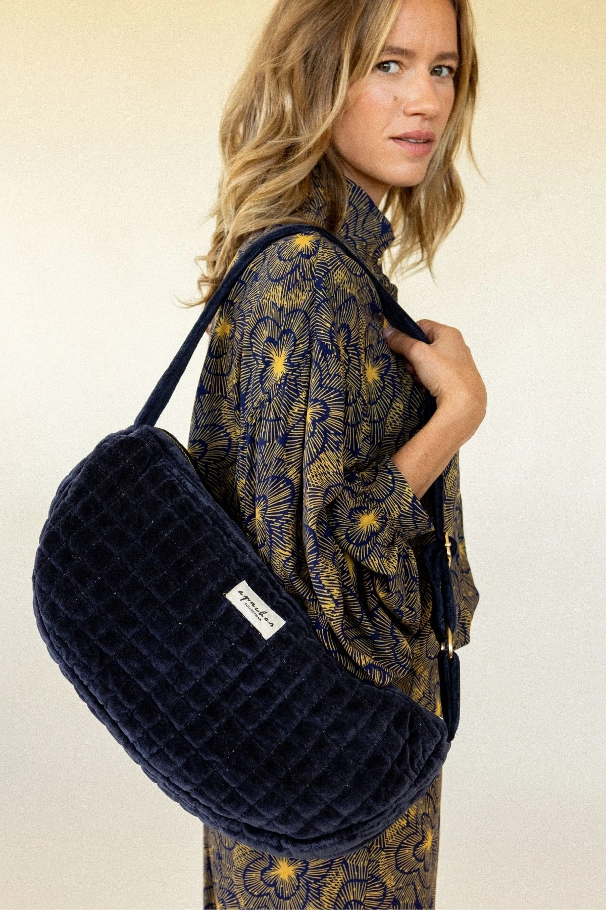 Craquez pour le sac banane SHANTI en velours, pratique et tendance. Son format lune et son motif graphique intemporel lui confèrent une allure unique. La bandoulière ajustable assure confort et liberté de mouvement, tandis que son espace compact accueille vos indispensables avec style.