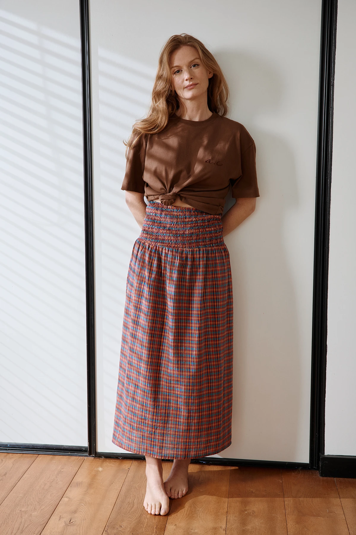 Adoptez la jupe JUHI longue en khadi de coton, au tissu artisanal souple et léger. Sa ceinture smockée flatte la taille tout en apportant confort et maintien. La coupe fluide et le tissu naturel offrent une allure élégante et authentique, parfaite pour des tenues décontractées ou habillées.