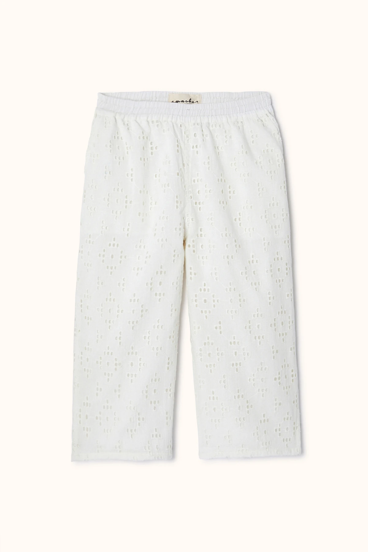 Adoptez le pantalon HITAM à jambes larges en broderie anglaise, doublé d’un voile de coton léger pour garantir confort et opacité. Sa taille entièrement élastiquée offre un ajustement facile, tandis que les poches italiennes ajoutent praticité et style à ce modèle élégant et aérien, idéal pour toutes vos journées.