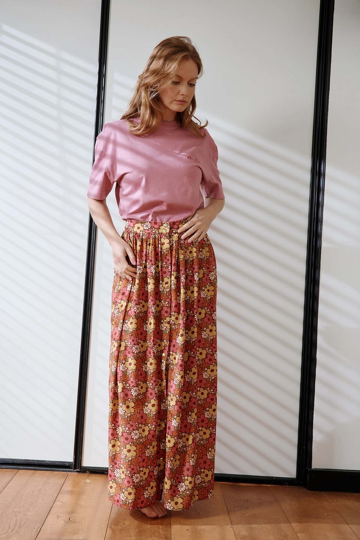 La jupe longue NEELA en viscose séduit par son tombé fluide et élégant. Son ouverture avant à patte de boutonnage avec boutons-pression dorés ajoute une touche lumineuse. La ceinture froncée offre confort et volume, sublimant la silhouette pour un look raffiné et féminin au quotidien.