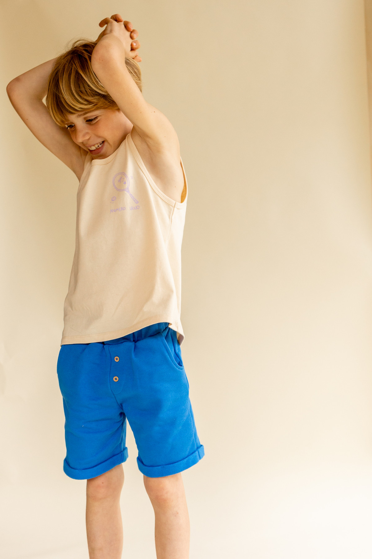 Faites de la place dans le dressing de votre mini pour notre nouveau short Soha en molletton confortable ! Ce bleu klein rayonnant se porte facilement avec un t-shirt, un marcel mais aussi avec un sweat pour une tenue décontractée. Coup de coeur pour l'imprimé raquette stylé "Numero Uno" apposé sur la poche arrière !