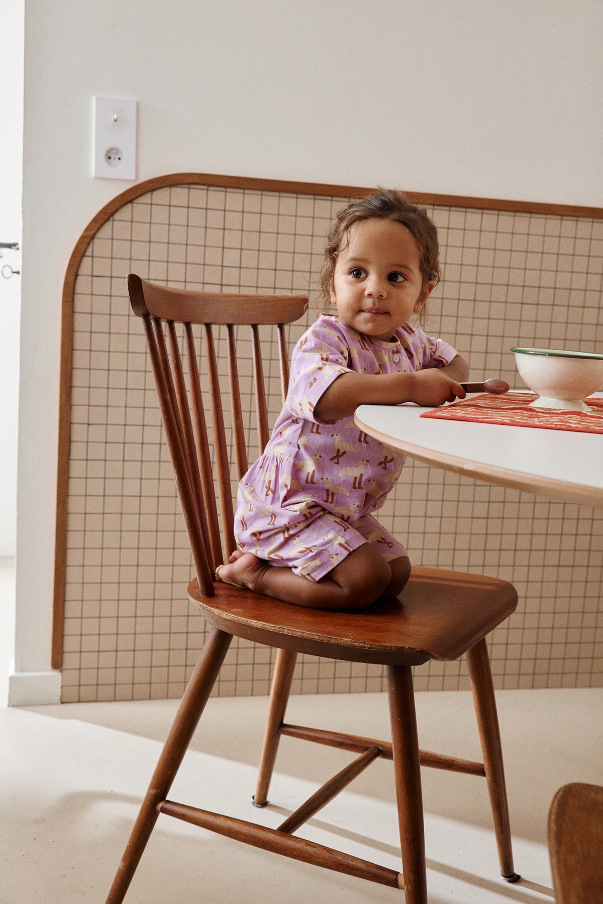 Adoptez le pyjama PIMO pour bébé, manches courtes et genoux couverts, pratique grâce à son ouverture frontale et ses boutons-pression à l’entrejambe. L’empiècement froncé au dos apporte volume et confort, offrant liberté de mouvement et douceur au quotidien.