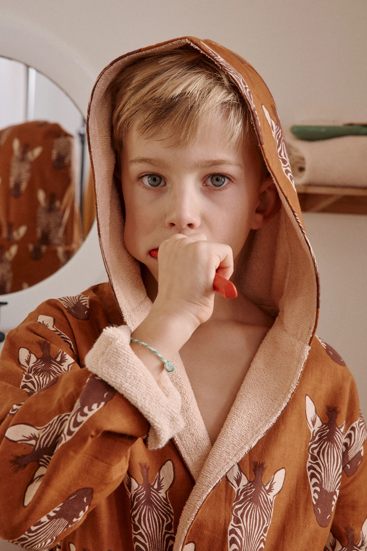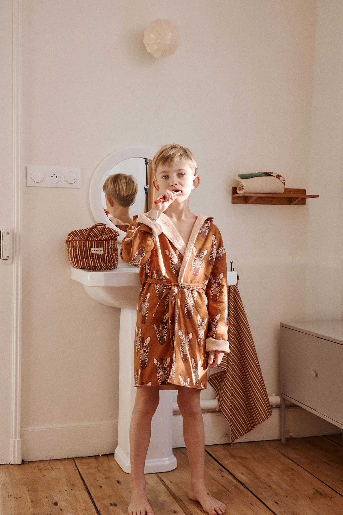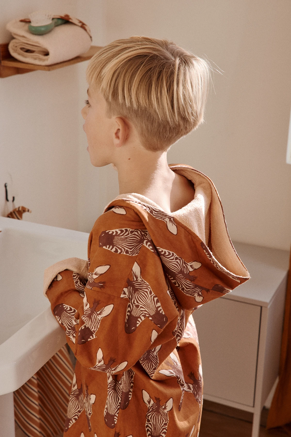 Le peignoir PALAYA en coton imprimé, doublé en éponge, allie confort et style. Sa capuche, son lien de serrage à la taille et sa longueur genoux en font un indispensable pour se sécher et se cocooner après le bain ou la douche.