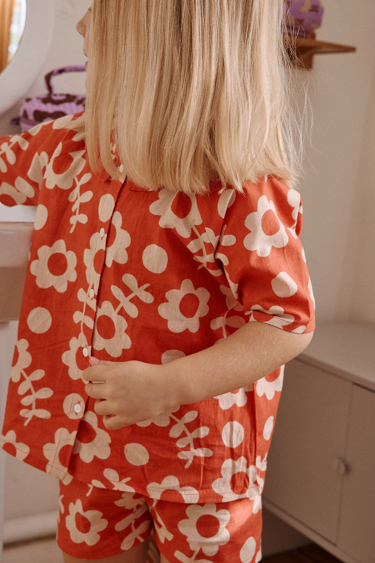 Le pyjama PASERA en coton séduit par son confort et son style. Son haut à col froncé avec biais à l’encolure et patte de boutonnage se combine à des manches courtes à revers, tandis que le short taille élastiquée assure une tenue agréable, longueur mi-cuisses.