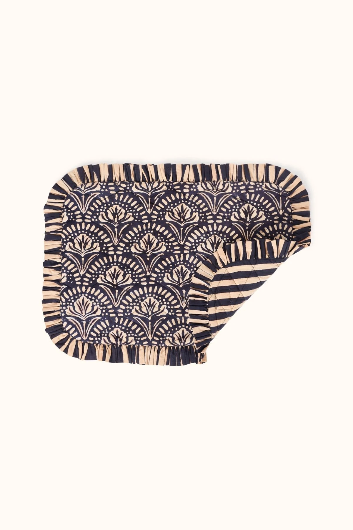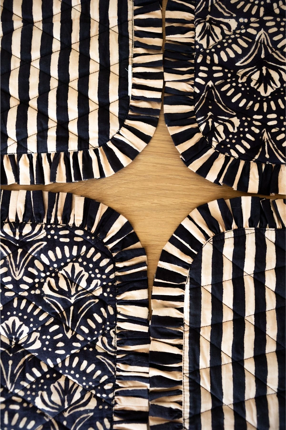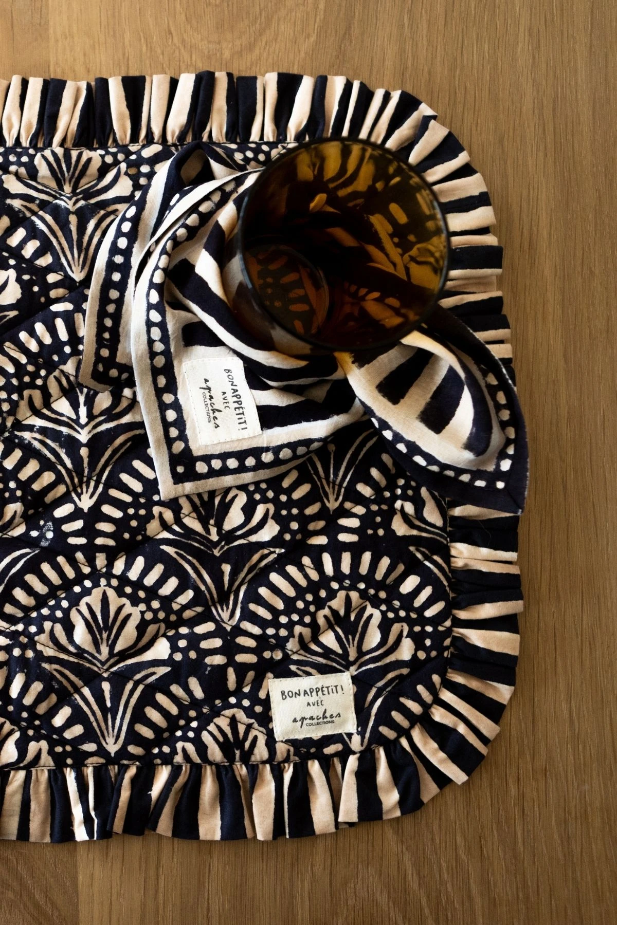 Sublimez vos repas avec nos sets de table rectangulaires SHIMLA réversibles et matelassés, ornés de volants délicats. Entre motifs indiens fleuris ou graphiques, ils s’adaptent à vos envies et apportent à chaque déjeuner ou dîner une touche élégante et chaleureuse, alliant praticité, style et raffinement à votre table.
