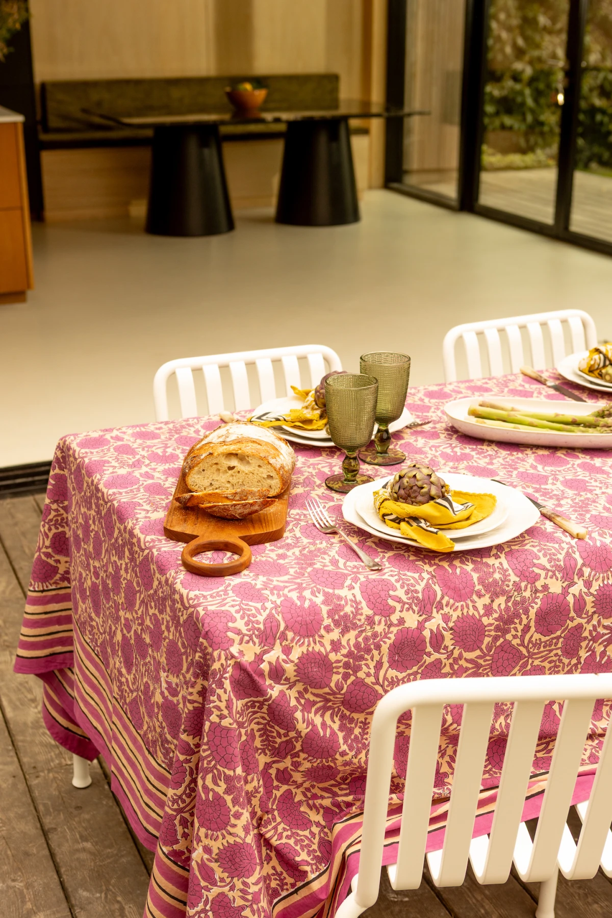 Mettez en valeur votre table lors de vos déjeuners et dîners grâce à notre nappe en coton. Cette bordure contrastée rayée offre un tombé unique pour des tables mixant fleurs indiennes et rayures, pleines de personnalité.