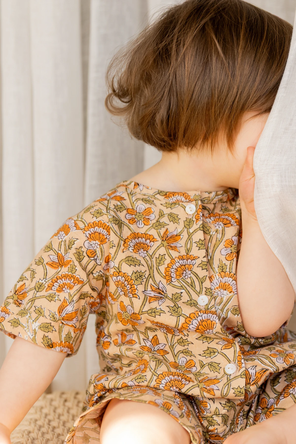 Un vent d'été souffle sur le vestiaire des tout-petits avec le pyjama Nuny en coton tout doux. On adore son imprimé floral aux teintes orangées et sa coupe confortable à manches et jambes courtes. Pratique au quotidien, il s’ouvre par boutons sur le devant et pressions à l’entrejambe. Le détail froncé au dos apporte une touche de volume pour plus d’aisance.
