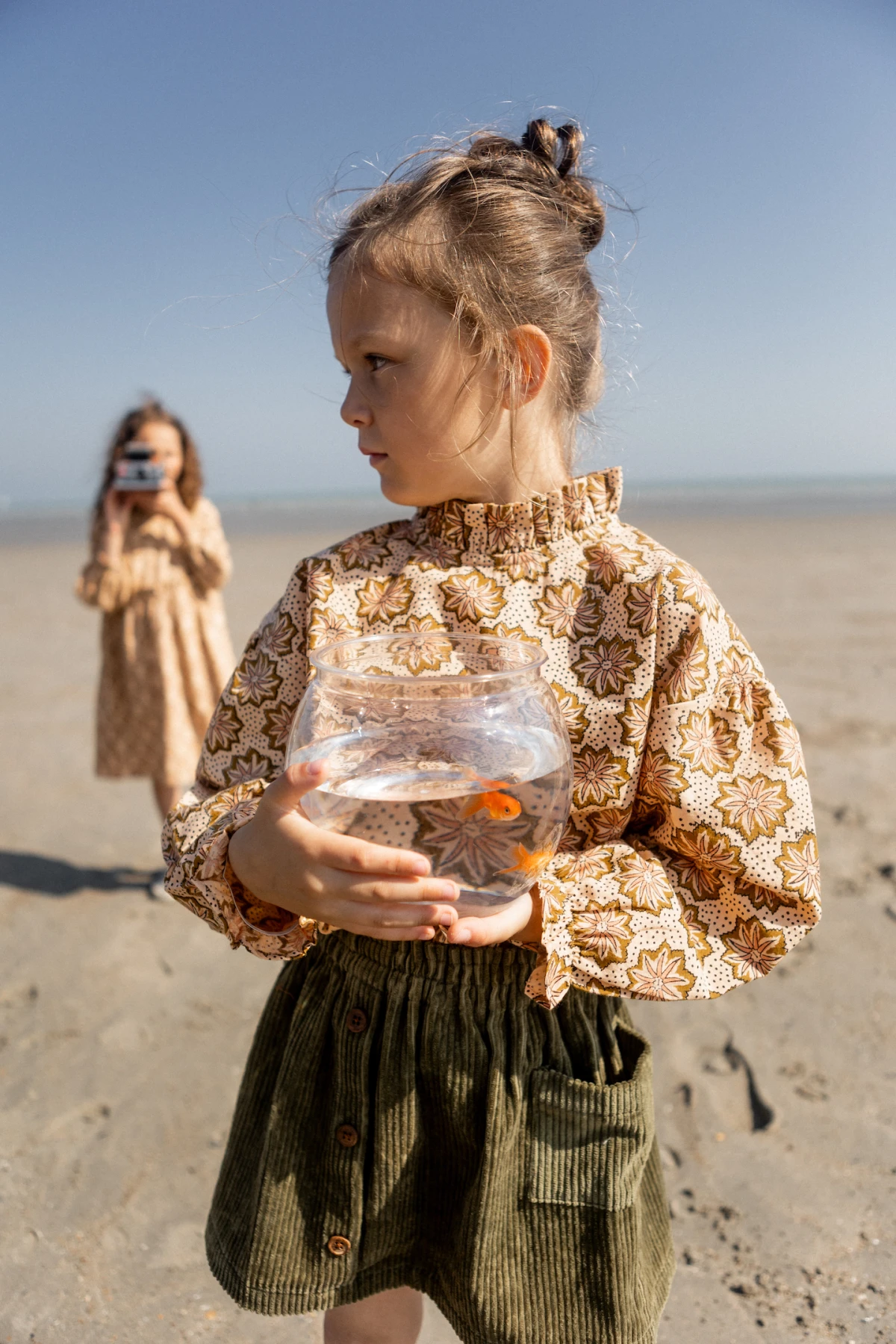 Notre jupe Tallan en velours côtelé kaki est aussi adorable que pratique pour les aventures quotidiennes. Courte et boutonnée à l'avant, elle est parfaite pour les journées d'école ou les sorties au parc. Pour un look adorable et stylé, combinez-la avec un de nos pulls ou sweats !