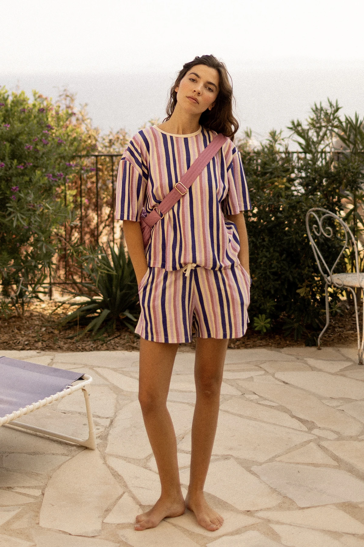Le short SHINA en tissu éponge allie confort et style décontracté. Taille ajustable avec lien à nouer pour un maintien parfait. Sa coupe ample, légèrement en biais à la base, lui confère une touche rétro et un esprit casual, idéal pour vos moments de détente avec élégance et praticité.