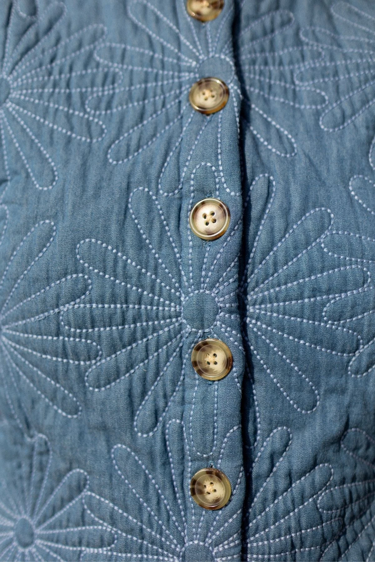 Le top AMAVAS en chambray à motifs fleurs séduit par sa coupe ajustée et son boutonnage sur le devant. Les pinces poitrine structurent la silhouette pour un rendu élégant et féminin. Sans manches et près du corps, il apporte confort et style pour un look raffiné au quotidien.