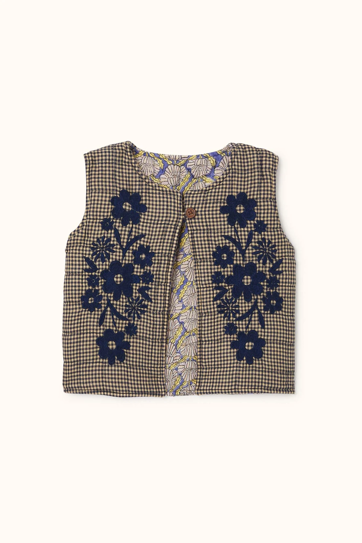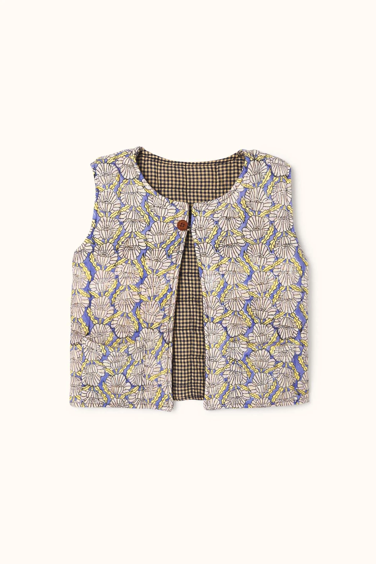 Découvrez le gilet SAKARU sans manches, réversible et matelassé, doublé en khadi de coton. Pratique et élégant, il propose des poches plaquées côté imprimé et une broderie décorative côté khadi. Sa fermeture à l’encolure par bouton en bois allie style et fonctionnalité au quotidien.
