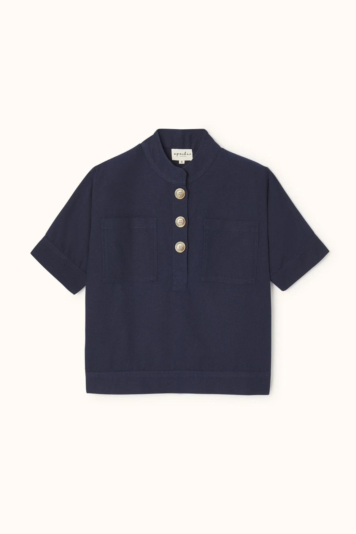 La blouse UMA en coton épais allie confort et style avec ses manches longueur coude et son col officier droit. Sa patte polo à trois boutons sur le devant facilite l’enfilage, tandis que les deux poches plaquées sur la poitrine apportent praticité et une touche structurée à cette pièce polyvalente et élégante.