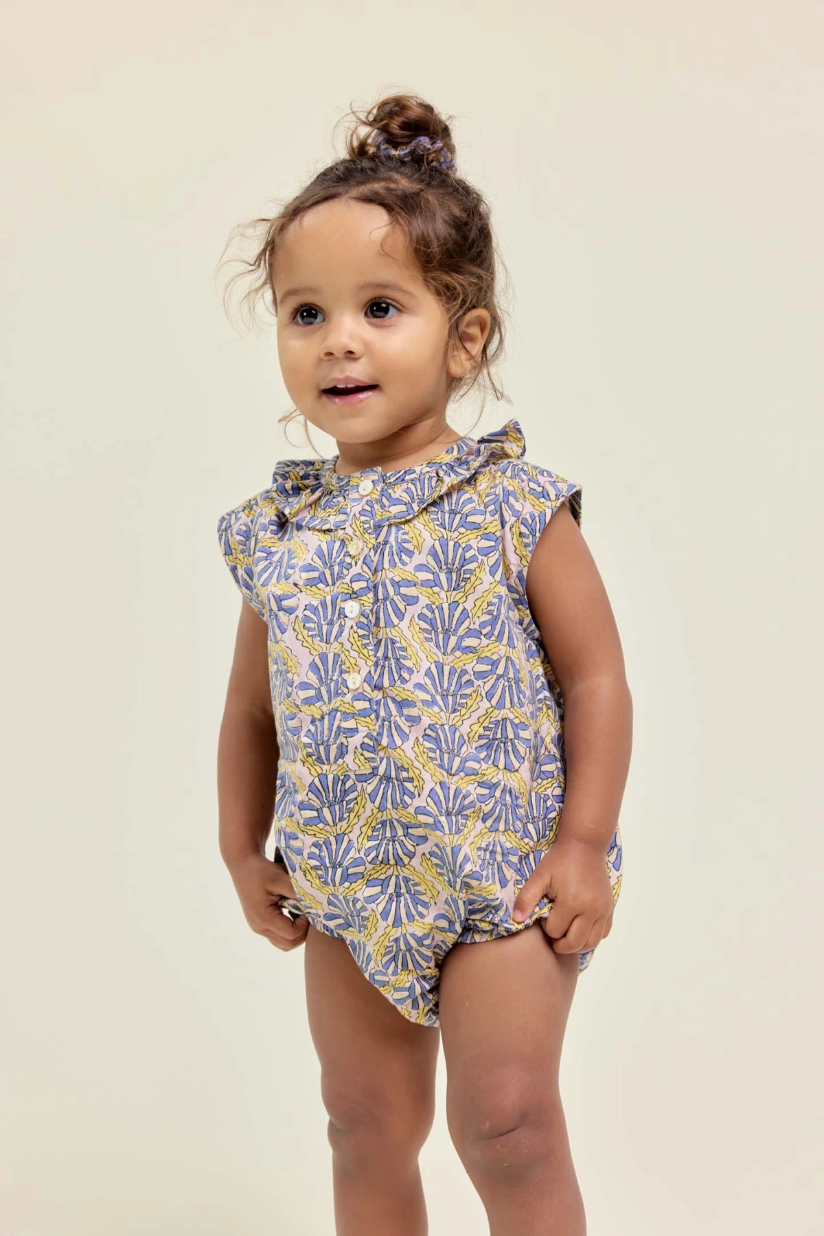 Craquez pour la barboteuse JASMINE en coton imprimé, légère et agréable à porter. Col volanté, style débardeur et ouverture boutonnée sur le devant pour un enfilage facile. Boutons-pression à l’entrejambe et coupe ample garantissent confort et liberté de mouvement pour bébé.