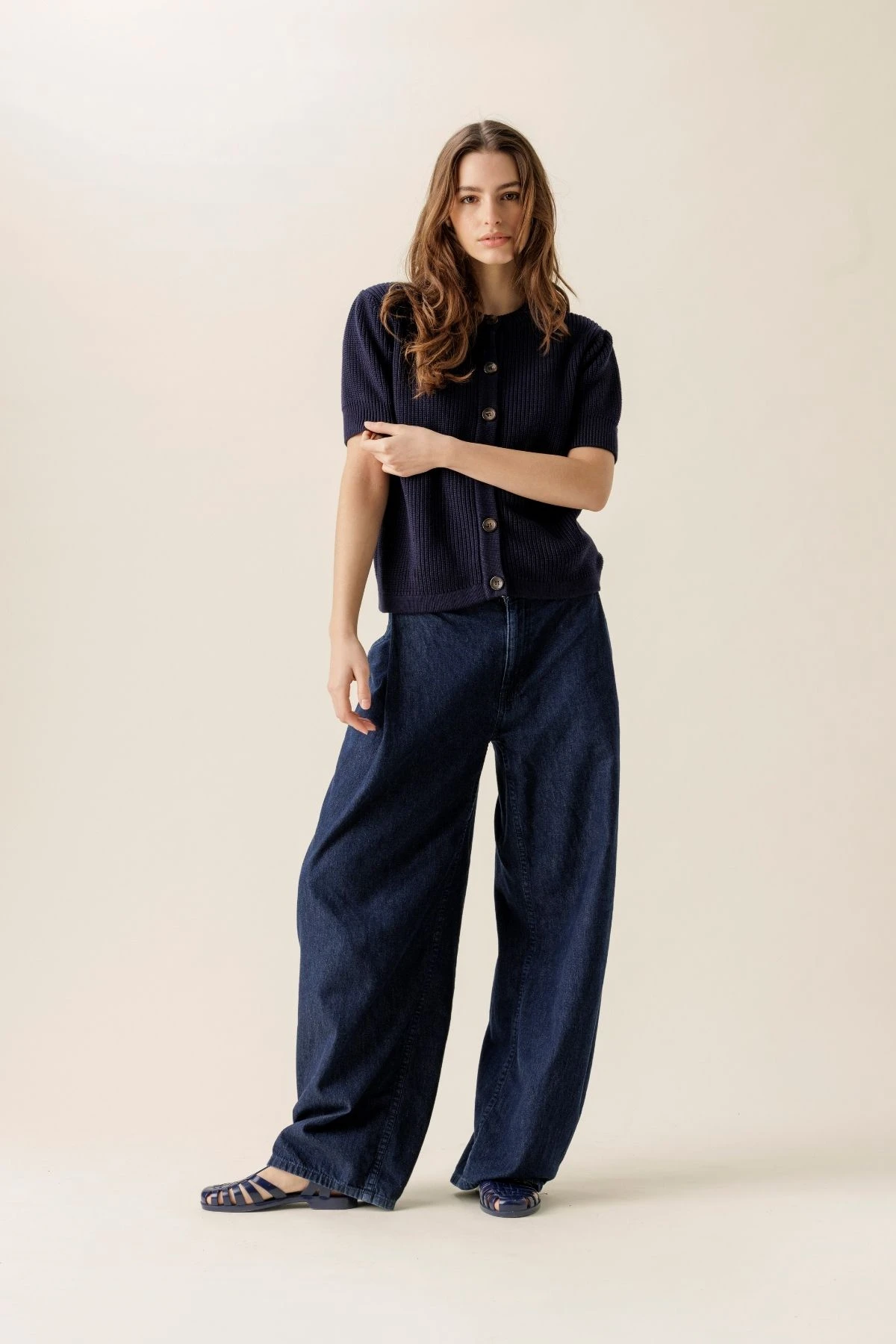 Le pull TISHKA à manches courtes en fine maille allie élégance et confort avec sa coupe droite et structurée. Coloris uni, patte de boutonnage sur l’avant et détails froncés aux épaules, resserrés à l’avant du bras. Finitions en bord-côte sur le col, les manches et la patte pour un style soigné et raffiné.