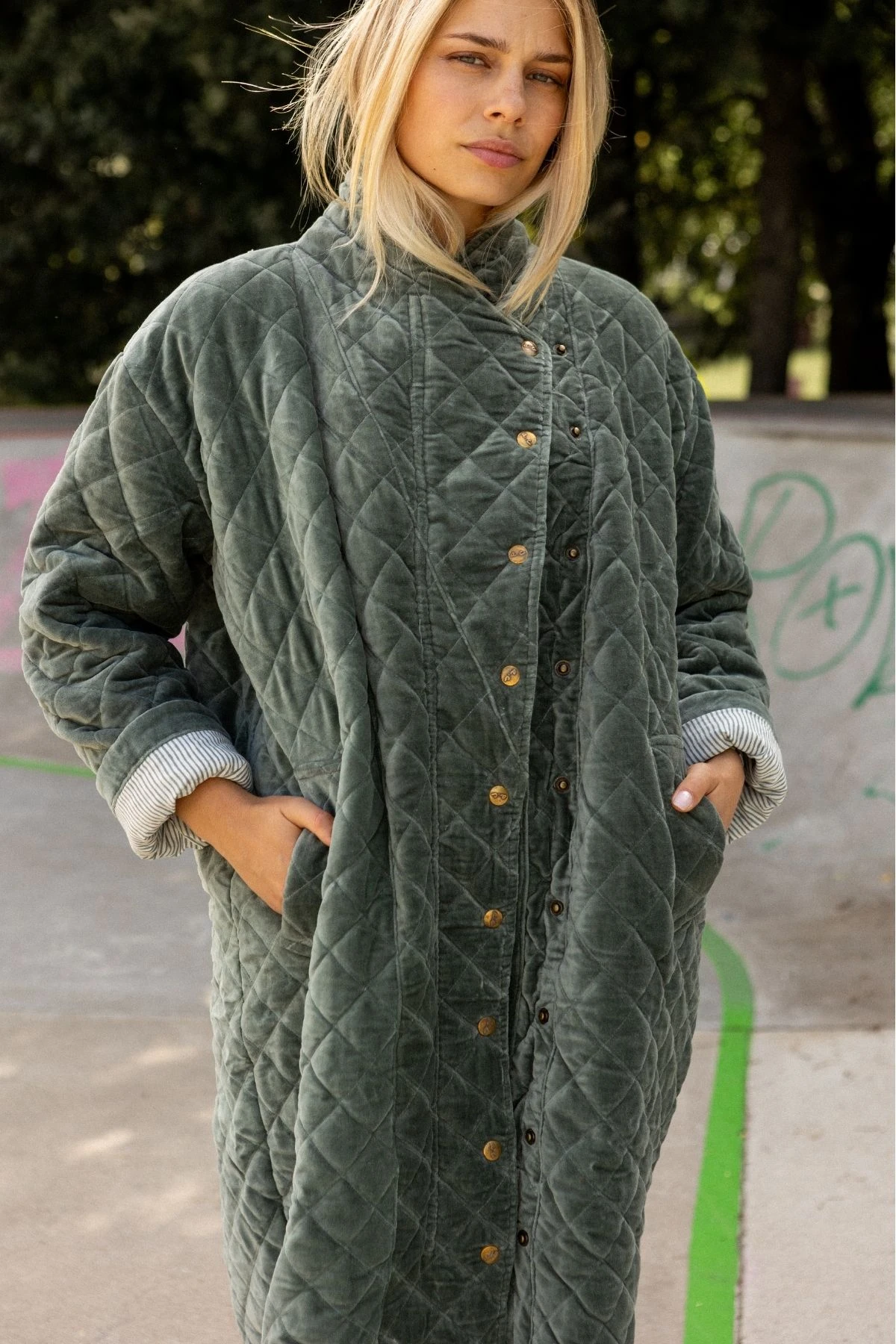 Le manteau JIYA en velours lisse matelassé est la pièce phare de la saison. Alliant douceur et chaleur, il assure un confort optimal face au froid. Son col haut croisé et sa fermeture discrète, mêlant zip caché et patte à boutons-pression, apportent une touche moderne et élégante, idéale pour sublimer vos looks d’hiver.