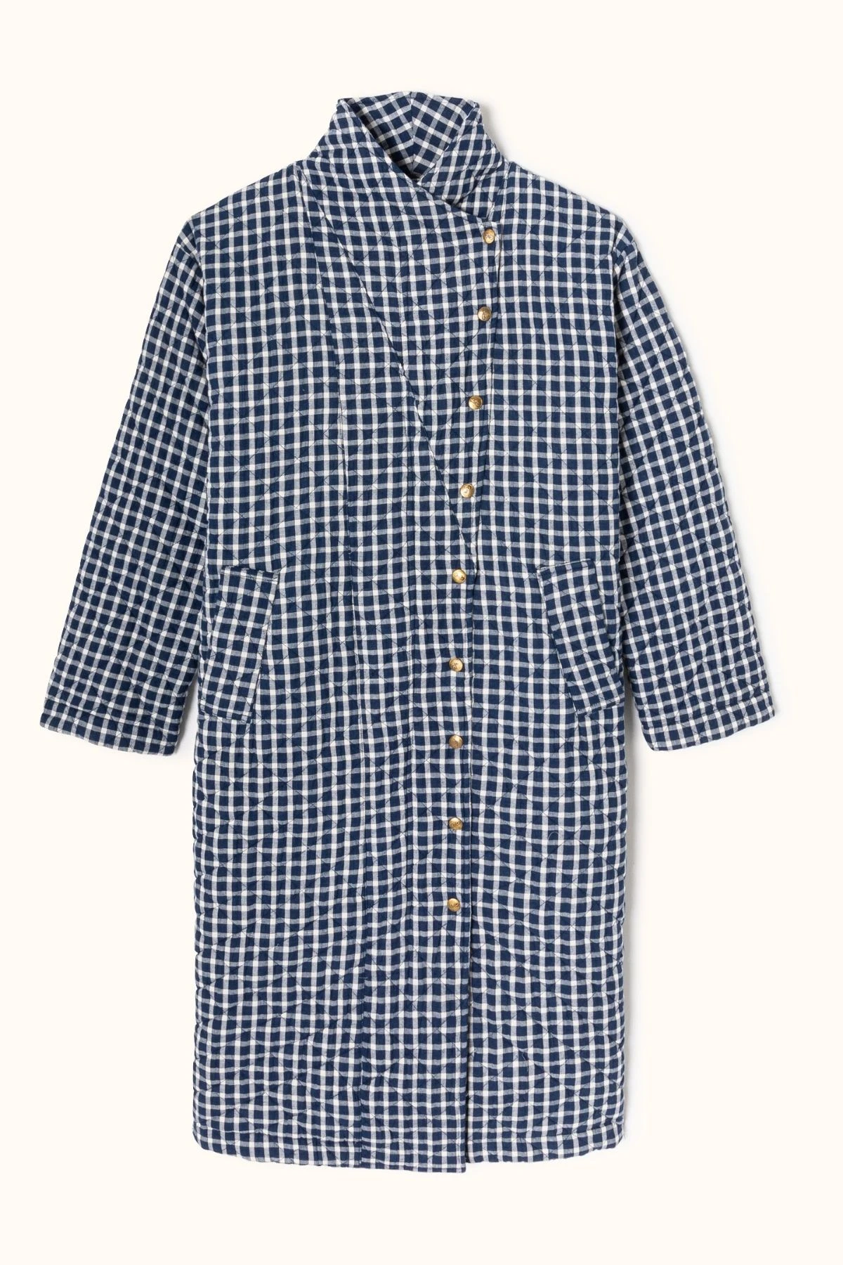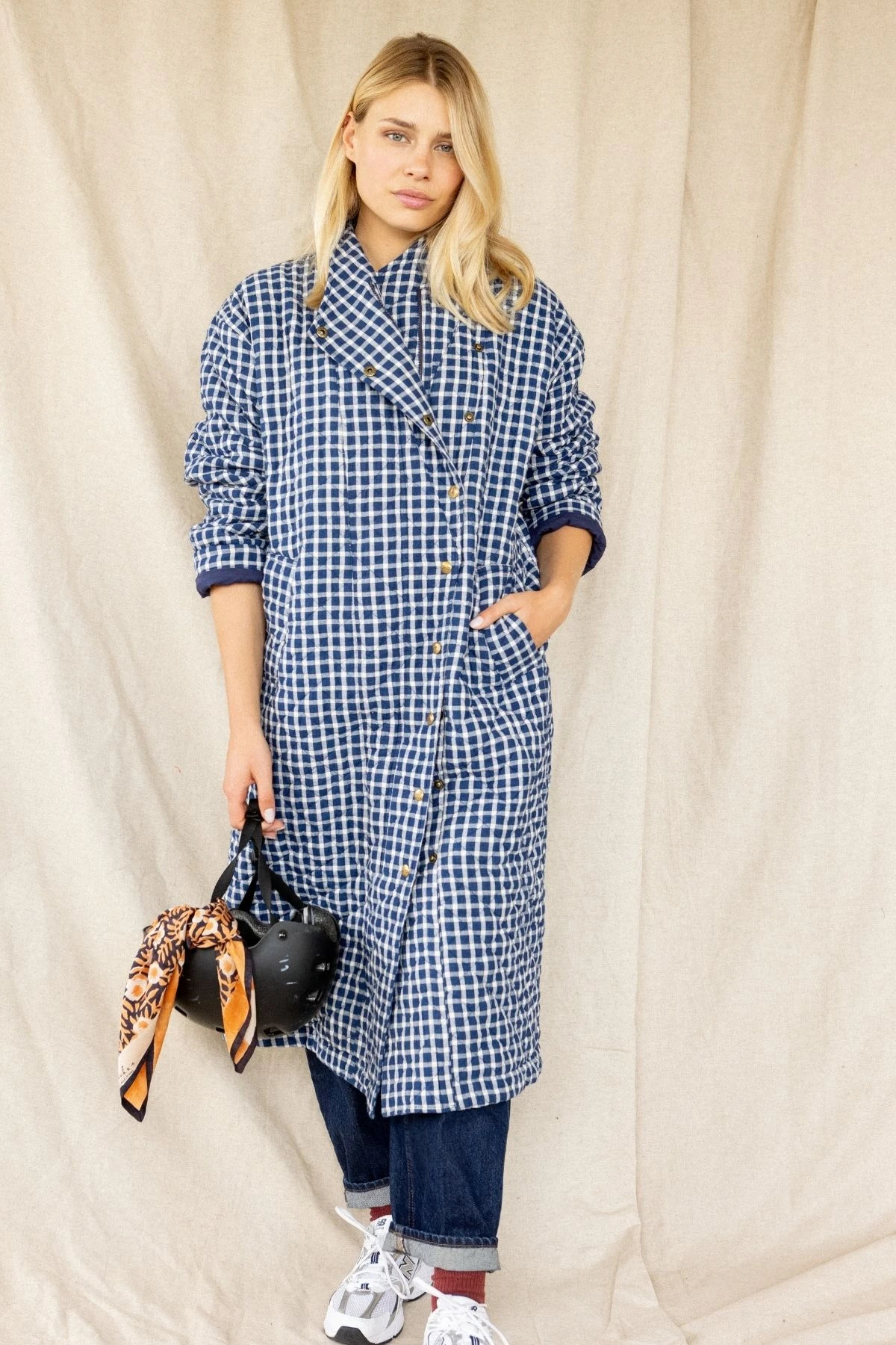 Adoptez le manteau JIYO, Khadi vichy navy pour conjuguer style et isolation. Sa texture douce vous enveloppe avec confort, tandis que son col croisé et sa fermeture soignée allient praticité et allure contemporaine. Un manteau tendance et fonctionnel, parfait pour traverser l’hiver avec élégance.