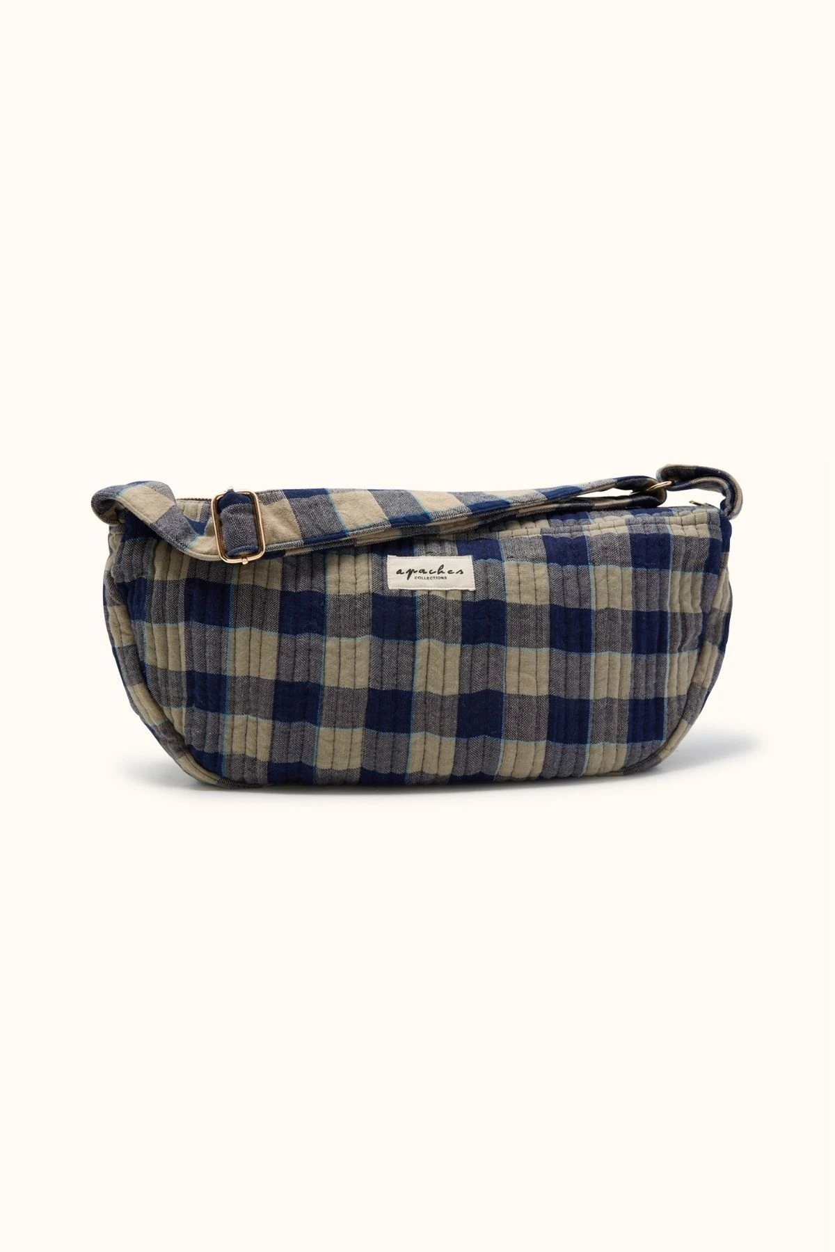 Craquez pour le sac banane Shanti KHADI en forme de lune, habillé de son imprimé carreaux navy au charme artisanal. Conçu en coton matelassé, il associe style et praticité avec sa bandoulière large et ajustable. Idéal pour transporter vos essentiels tout en gardant les mains libres, il devient vite un indispensable du quotidien.