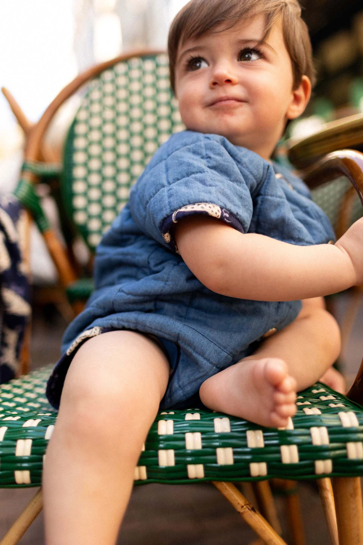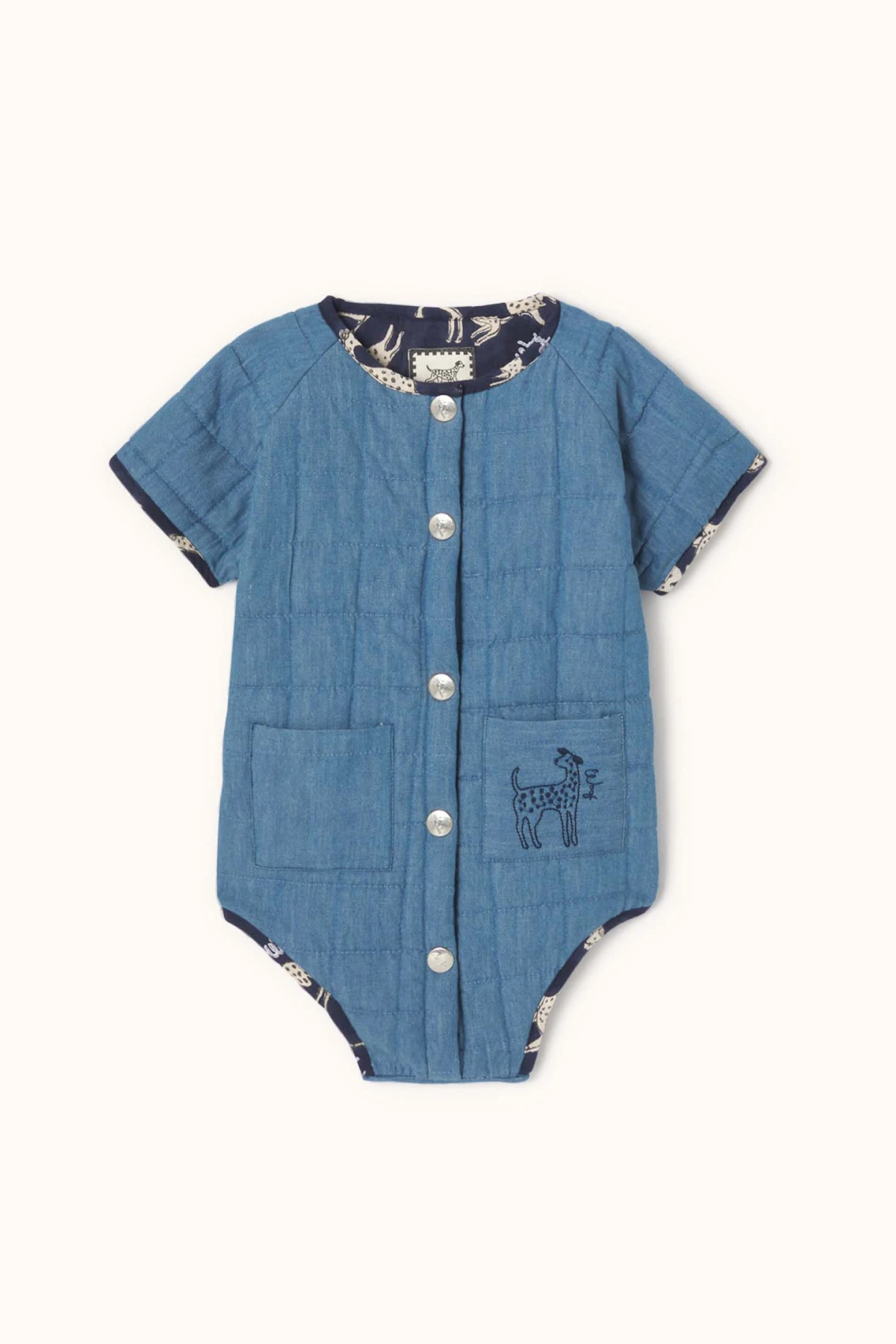 La barboteuse DADY en chambray de coton légèrement matelassé offre maintien et confort pour bébé. Manches courtes raglan et finitions en biais aux extrémités. Ouverture boutonnée sur toute la longueur et boutons-pression à l’entrejambe pour un habillage facile. Poche plaquée avec broderie décorative.