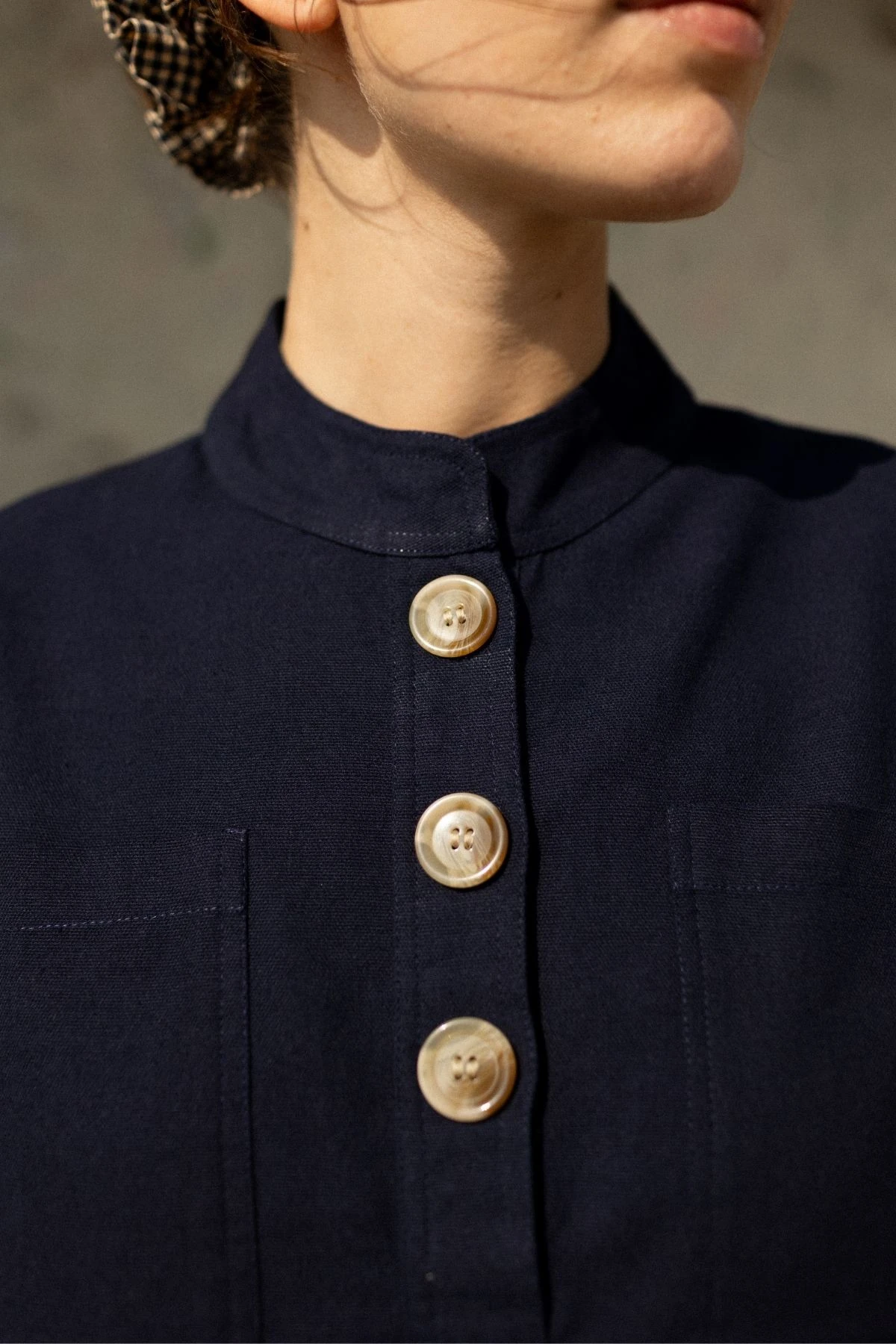 La blouse UMA en coton épais allie confort et style avec ses manches longueur coude et son col officier droit. Sa patte polo à trois boutons sur le devant facilite l’enfilage, tandis que les deux poches plaquées sur la poitrine apportent praticité et une touche structurée à cette pièce polyvalente et élégante.