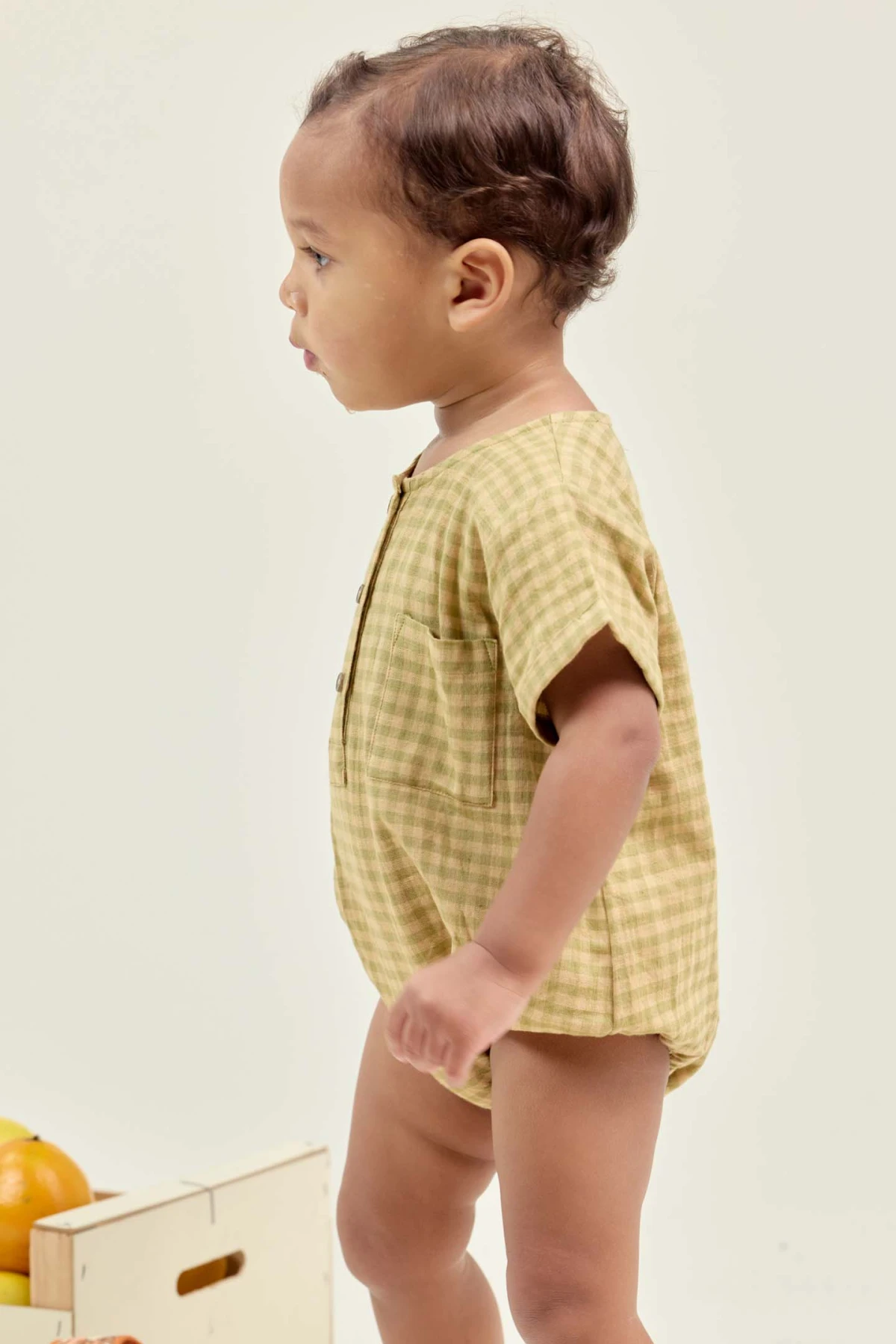 La barboteuse MANIK en khadi de coton léger assure confort et liberté de mouvement. Col rond, manches courtes à revers et coupe ample. Ouverture boutonnée sur le devant et boutons-pression à l’entrejambe facilitent l’habillage au quotidien. Idéale pour bébé, douce et pratique.