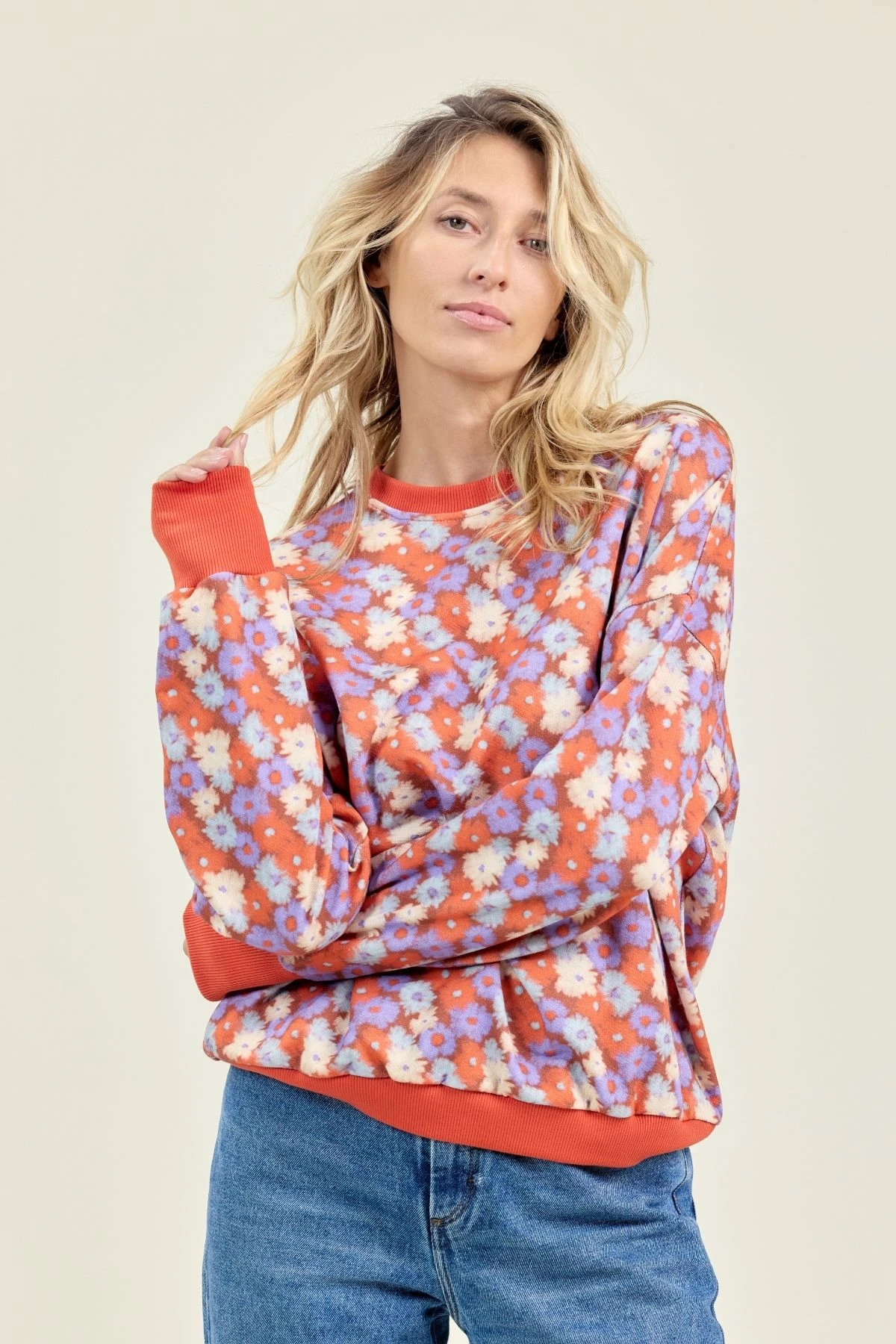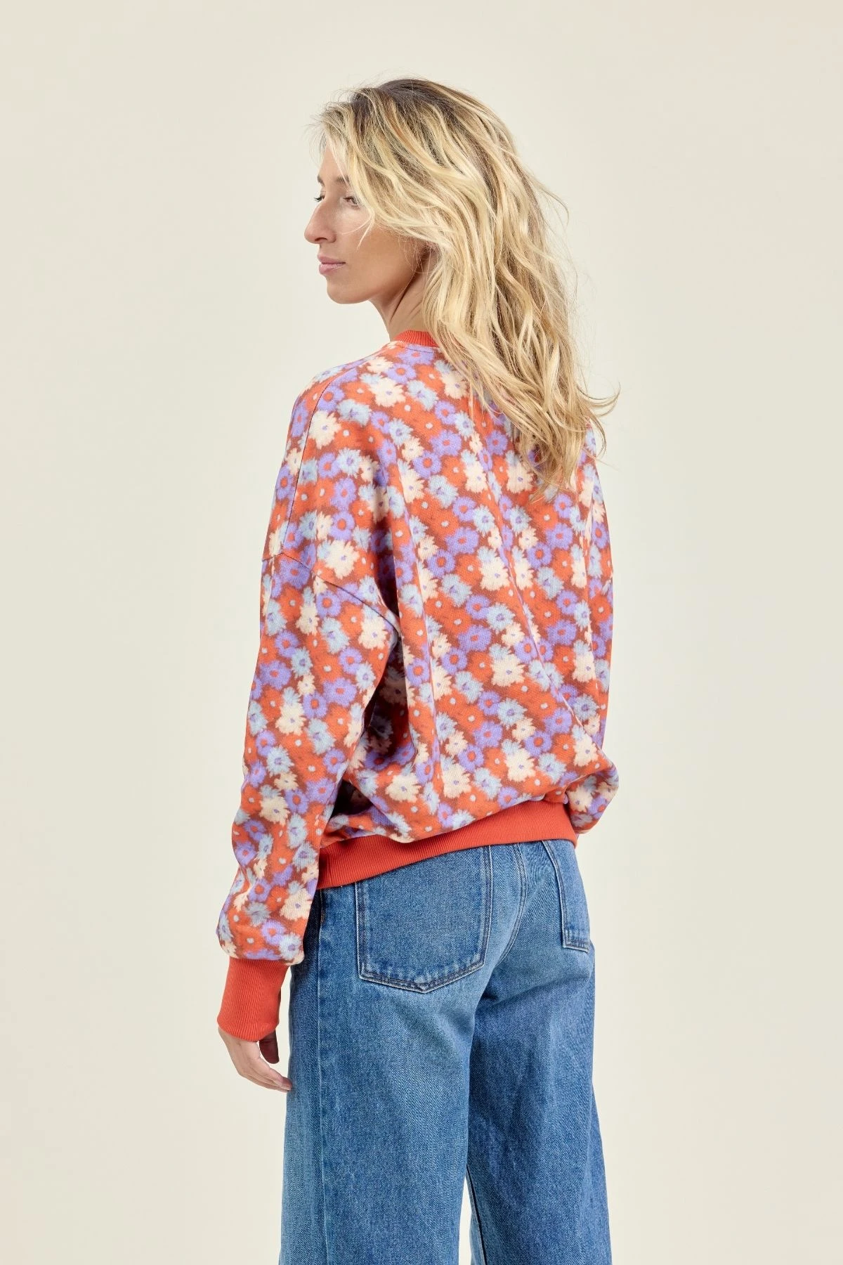 Le sweat NIRALA à coupe ample séduit par son imprimé all-over tendance. Bord-côte contrasté au col et aux poignets, épaules tombantes et poignets larges pour un confort optimal. Idéal pour un look casual moderne, il allie style graphique et décontraction pour vos tenues quotidiennes avec élégance.