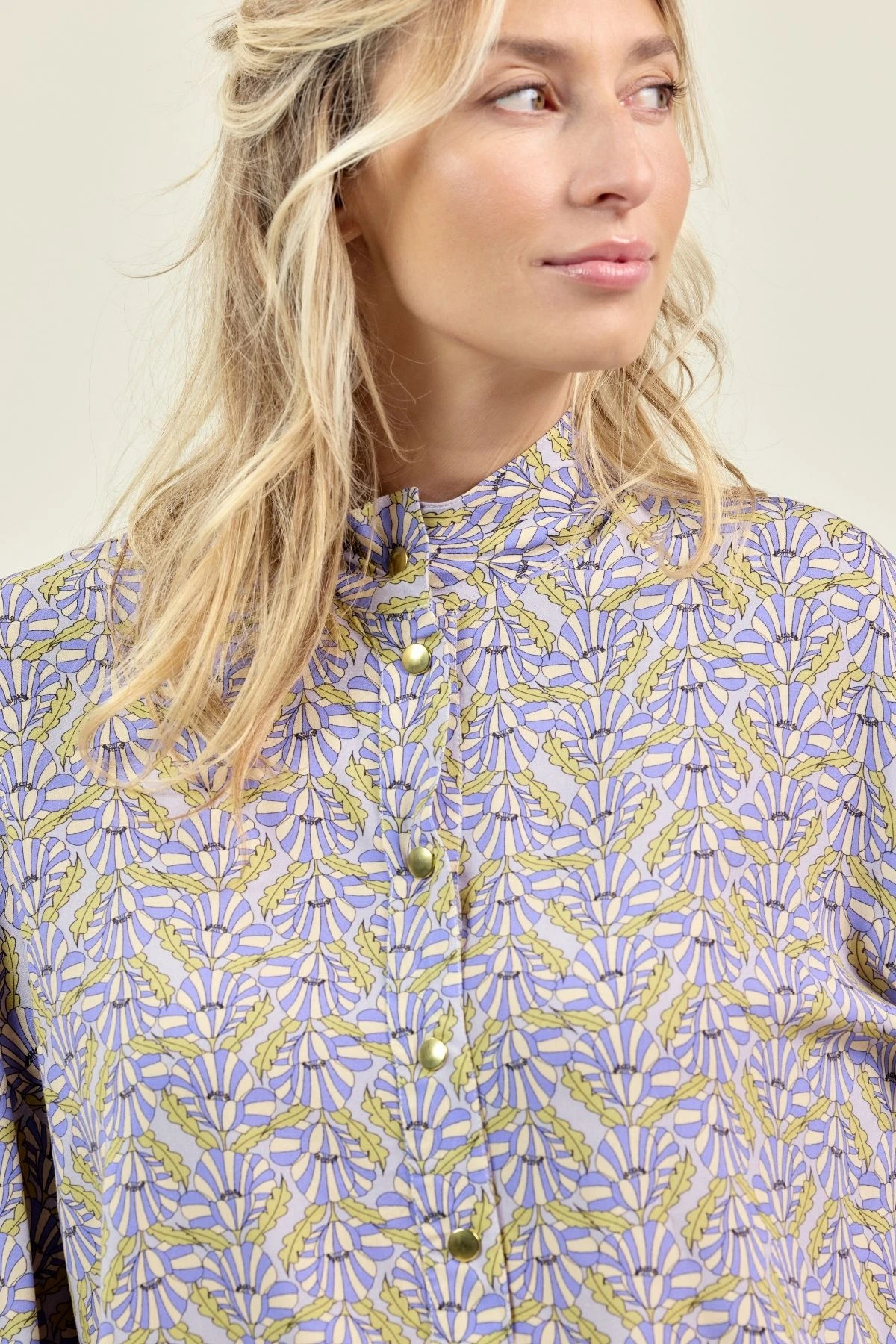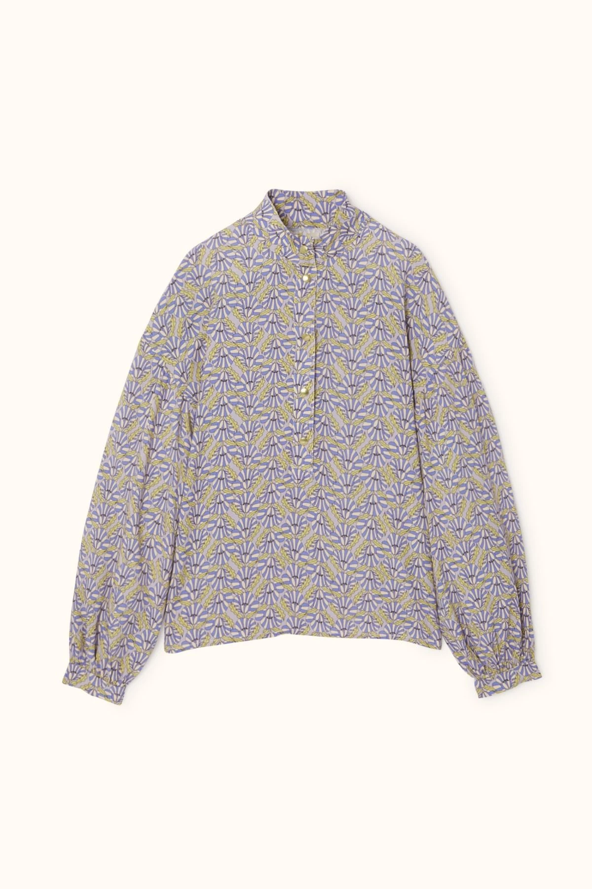 La chemise VIDYA en viscose fluide séduit par son col mao élégant et sa patte polo ornée de pressions dorées. Ses manches ballon, froncées aux épaules et resserrées aux poignets, créent un volume féminin raffiné. Un haut chic et léger, parfait pour un look moderne et élégant au quotidien.