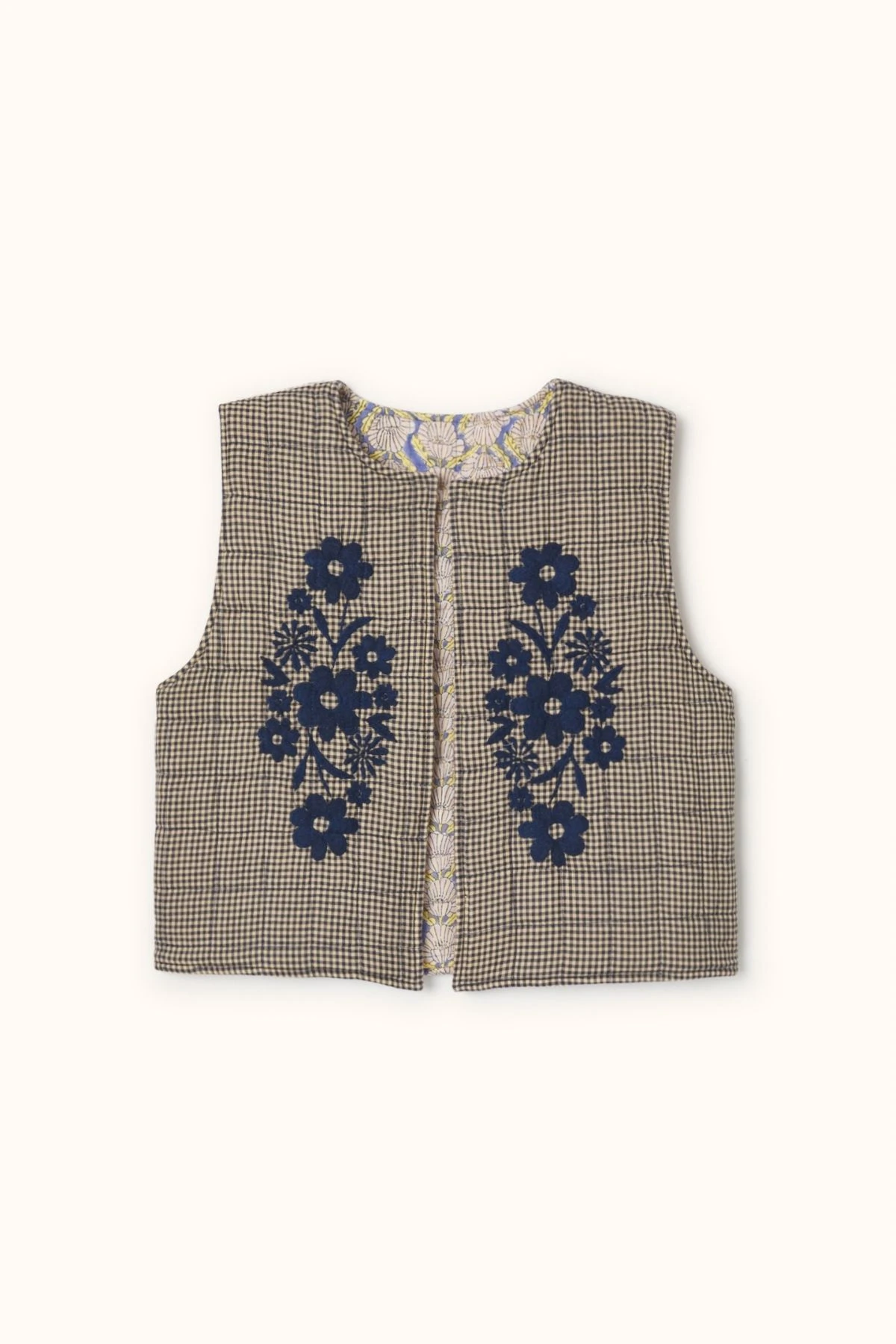 Adoptez le gilet sans manche SAKARA, matelassé et réversible, pour un look modulable. Côté khadi de coton brodé ou côté imprimé avec poches plaquées, il allie confort et style. Sa coupe droite et courte assure un porté moderne et polyvalent, parfait pour compléter vos tenues avec originalité et élégance.