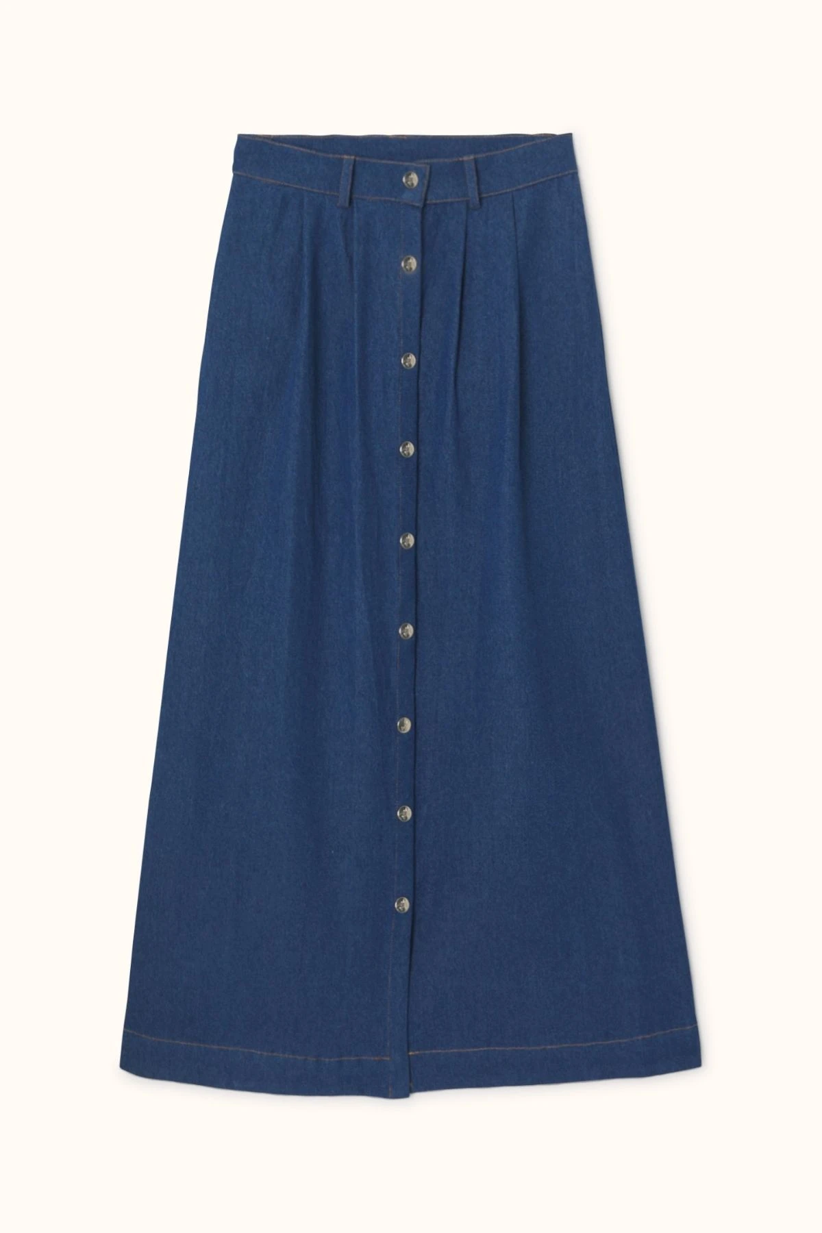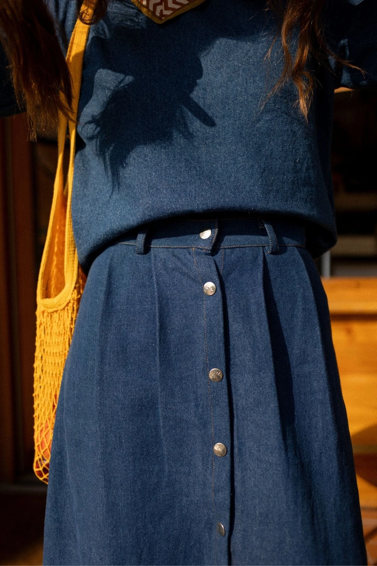 La jupe JANANI longue allie confort et élégance avec sa coupe évasée et ses plis subtils à l’avant, offrant légèreté et mouvement. Fermeture par rangée de boutons-pression argentés « A.C », deux poches passepoilées à l’arrière et ceinture à passants pour personnaliser le look. Un essentiel stylé et pratique.