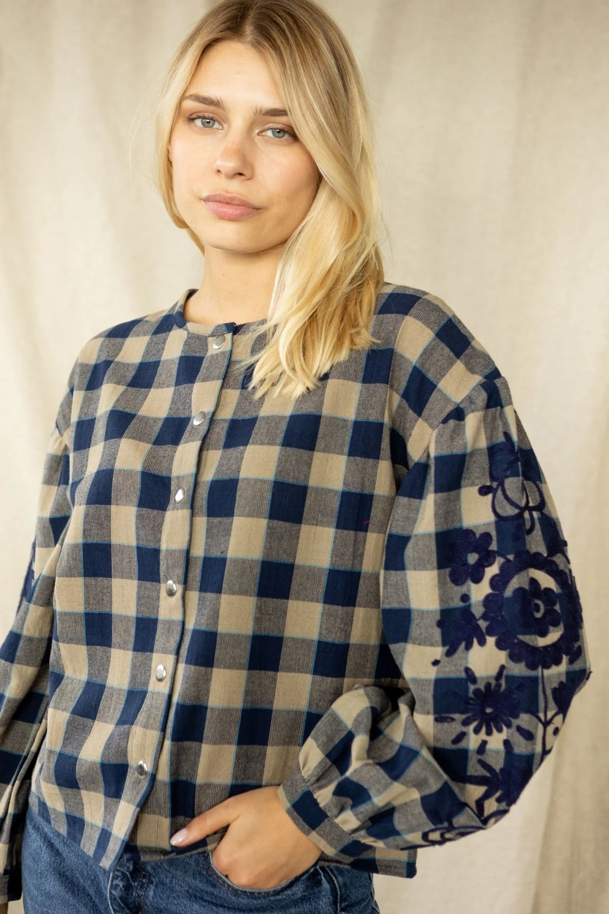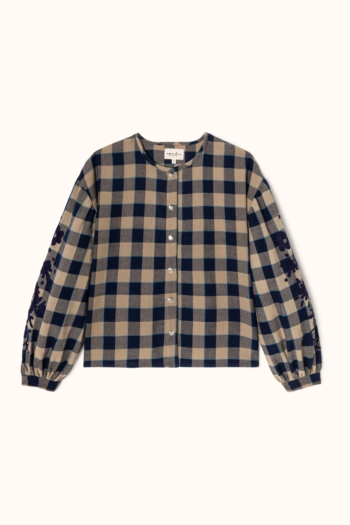 La chemise BINU réinvente l’intemporel motif à carreaux avec une note féminine et raffinée. Confectionnée en coton khadi, elle se distingue par ses broderies délicates sur les manches et sa patte de boutonnage à pressions qui mêle confort et élégance. Ses manches légèrement froncées ajoutent une touche de style unique à vos tenues quotidiennes.